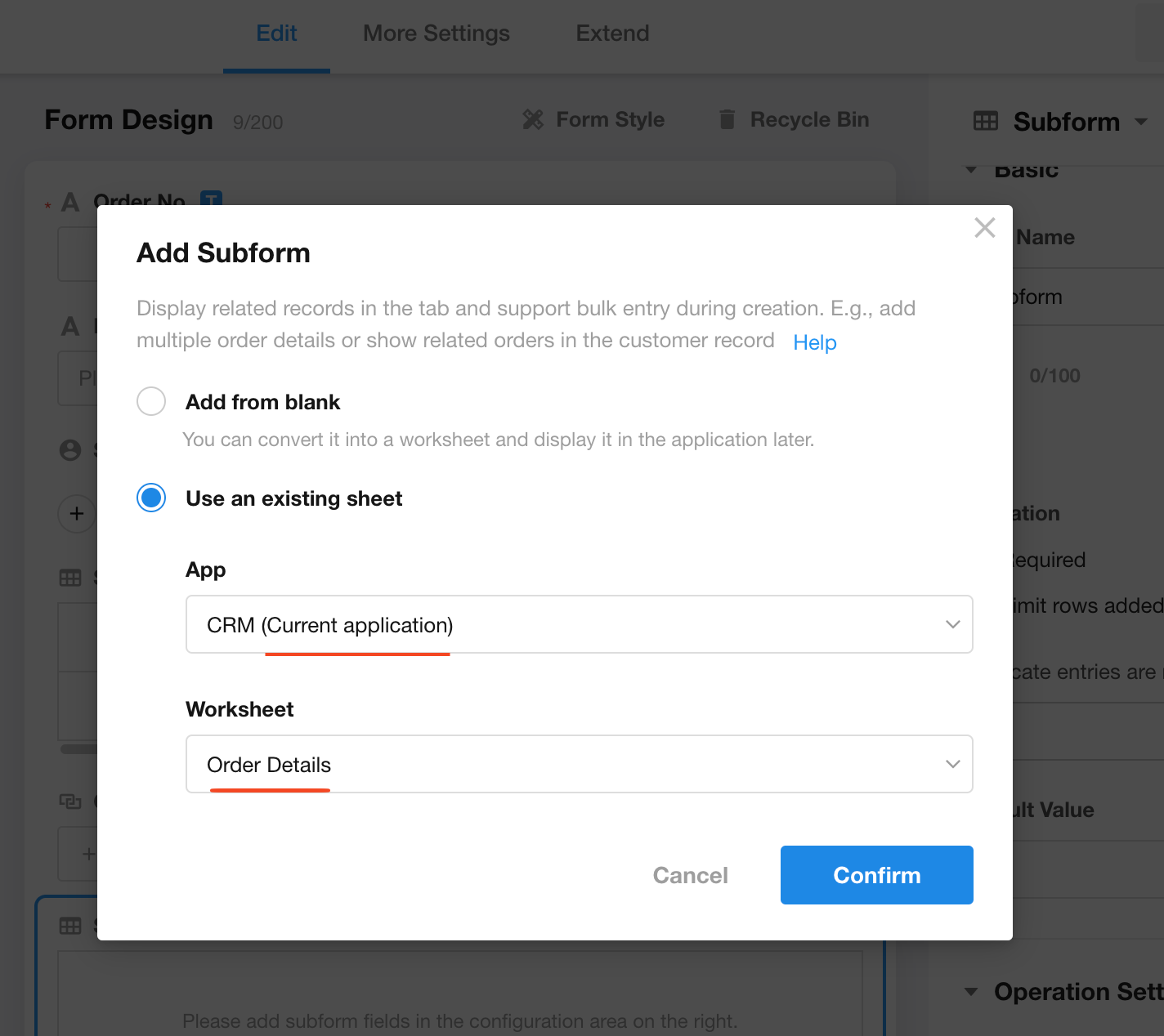 Add from blank: Create and design a new subform. This subform is a virtual or hidden worksheet that won't appear in the worksheet navigation. It can only be viewed and added data when accessing the main worksheet (e.g., the order worksheet is the main worksheet).