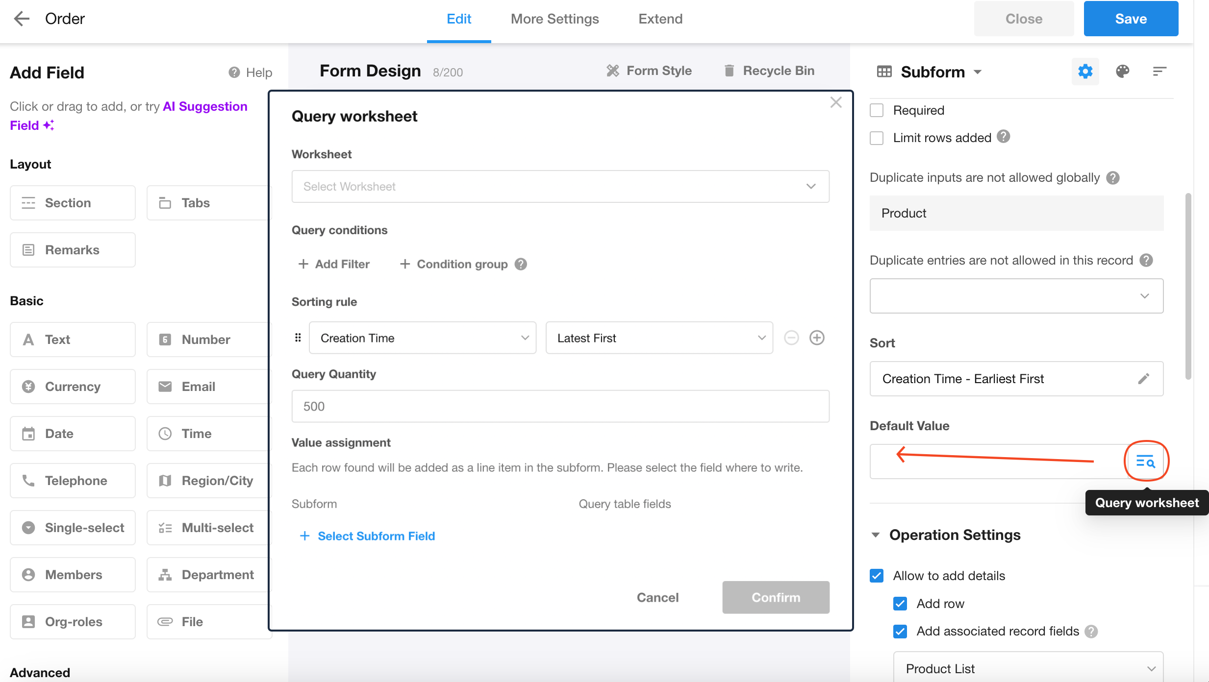 If you've already created a worksheet with a structure suitable for a subform, you can directly reference it as a subform. This eliminates the need to configure subform fields - you only need to specify which fields to display.