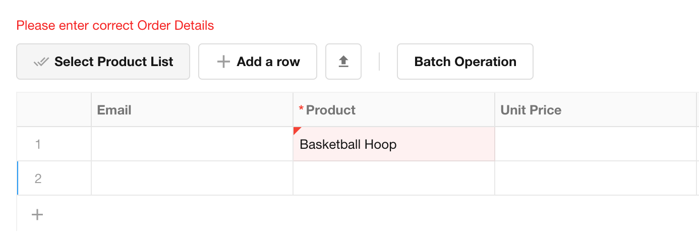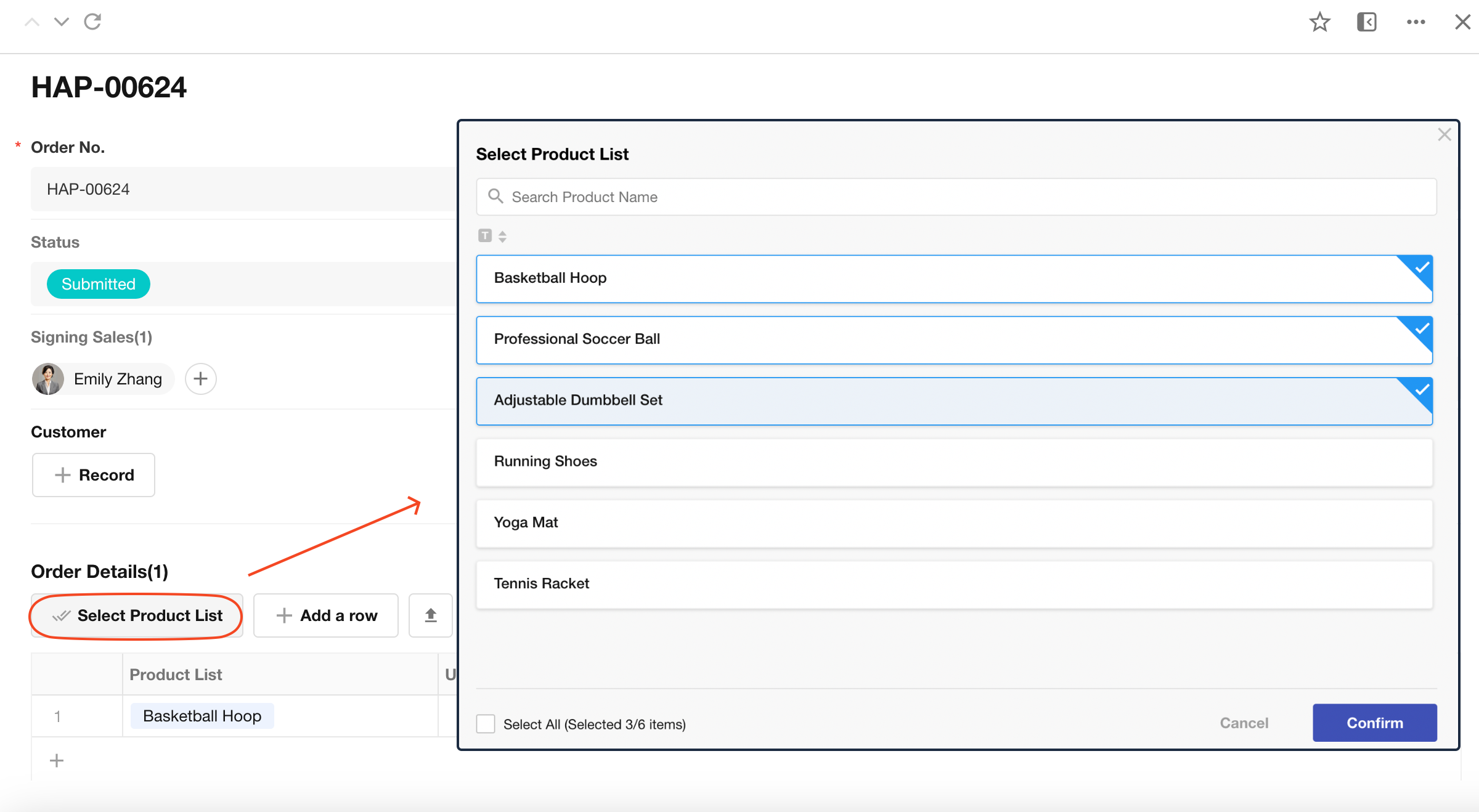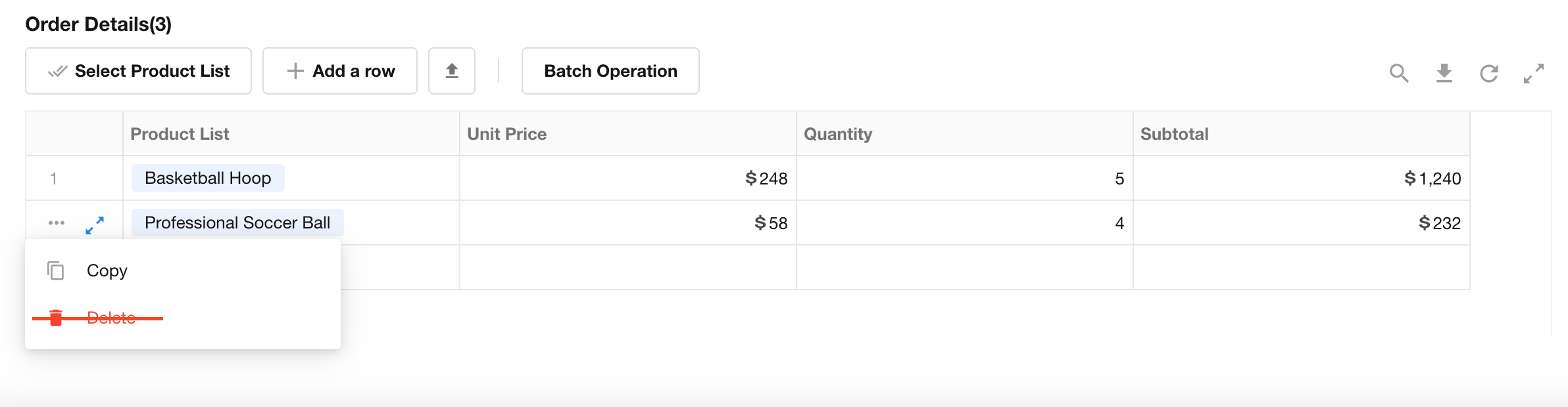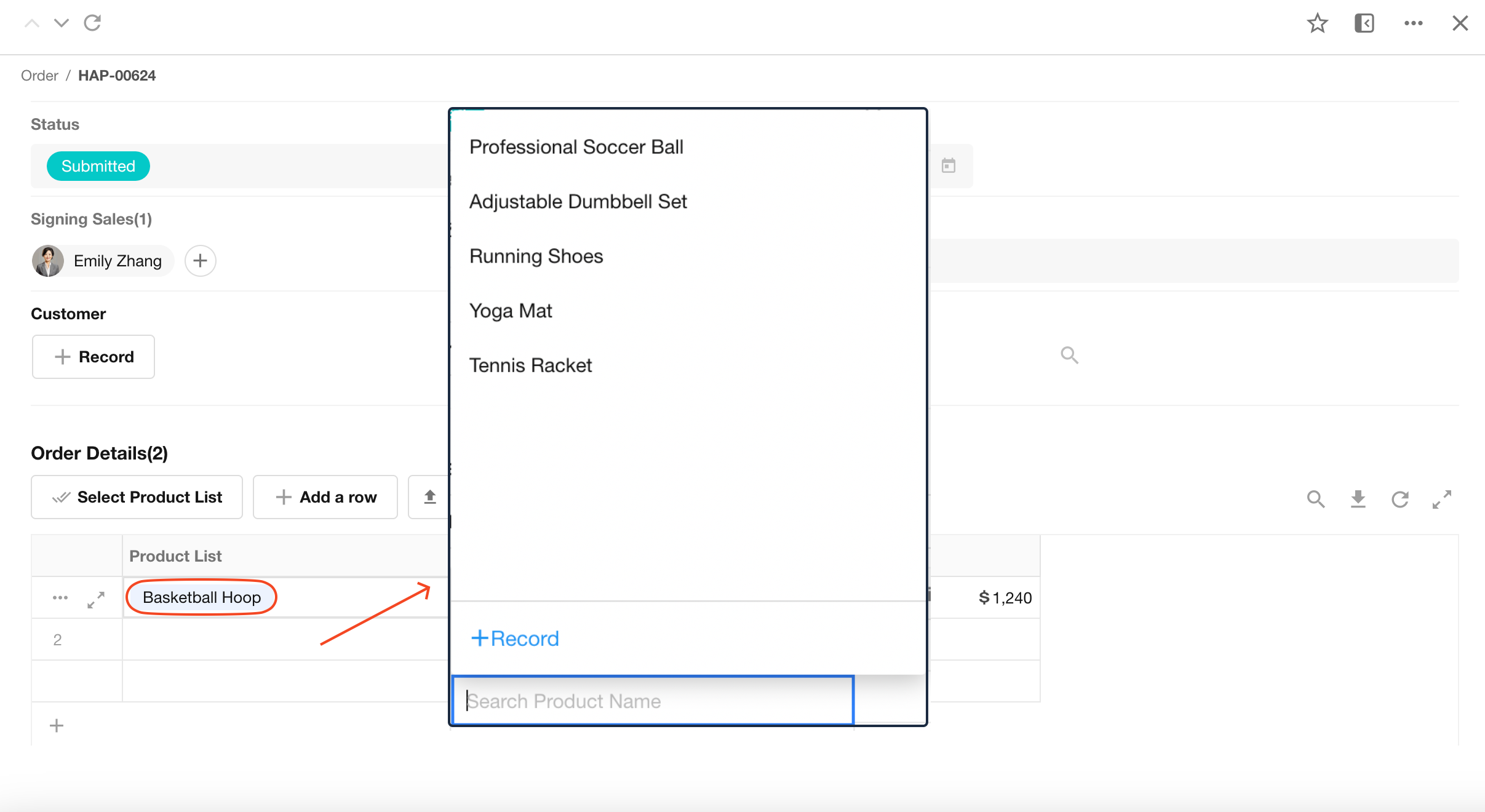 Example: If "Basketball Hoop" is already selected in the subform, it won't be displayed in the list when adding another row to the subform.