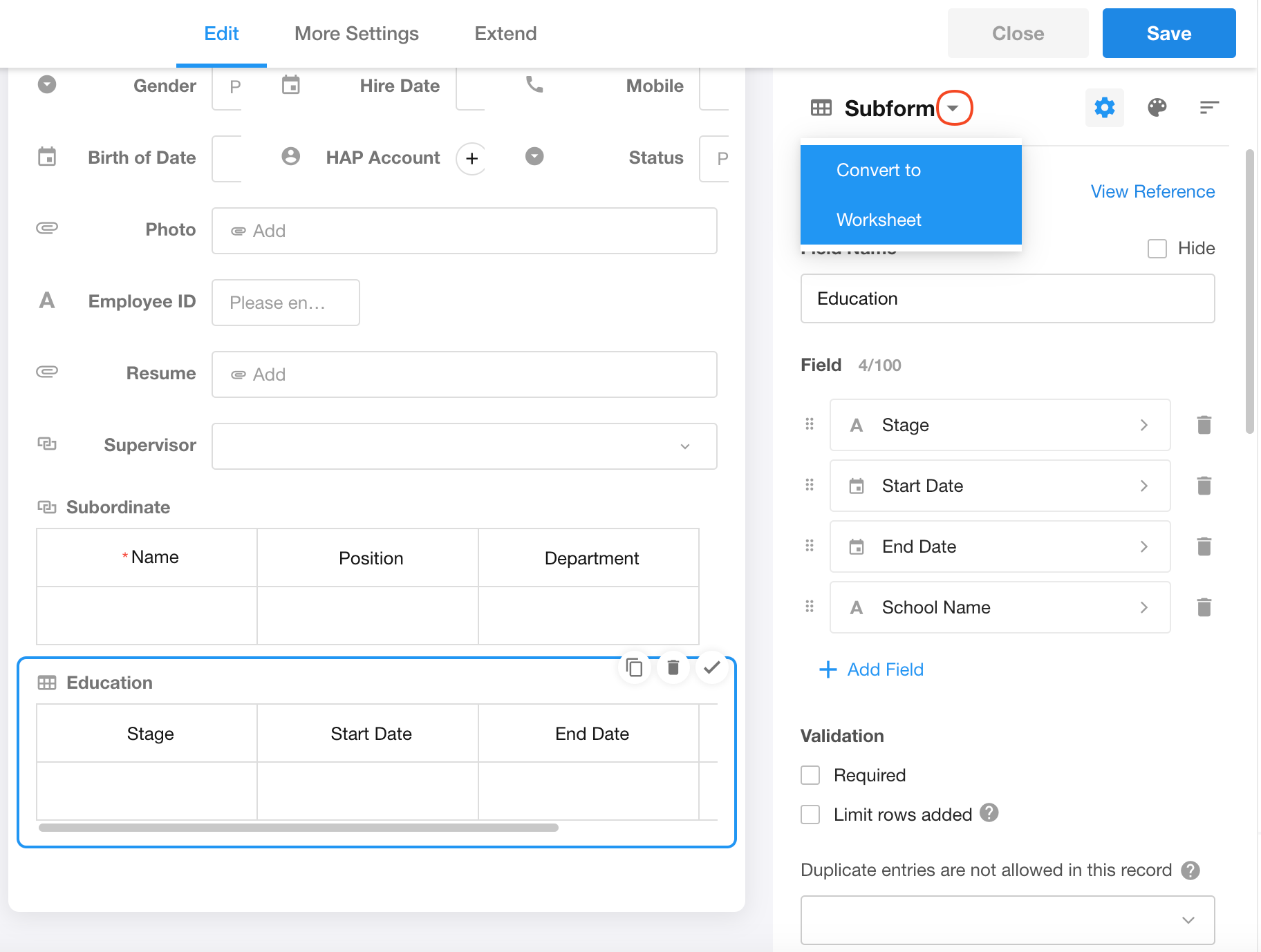 Similarly, a relationship field can be converted into a subform field, effectively referencing an existing worksheet as a subform.