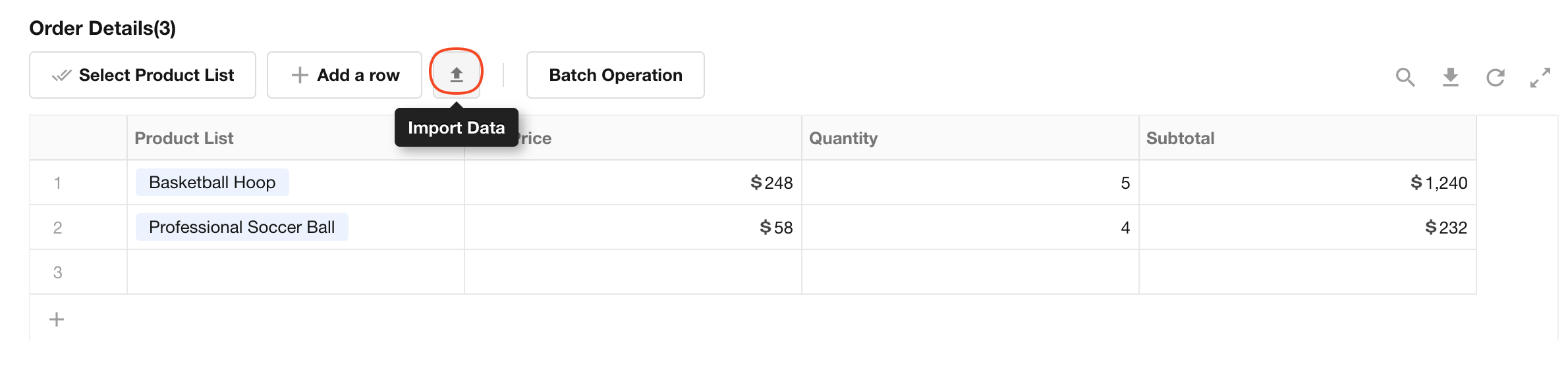 There are many ways to add data to a subform: users can manually add a row of data, add data in bulk (available when the subform contains relationship fields), import data, or copy existing data from the same subform.