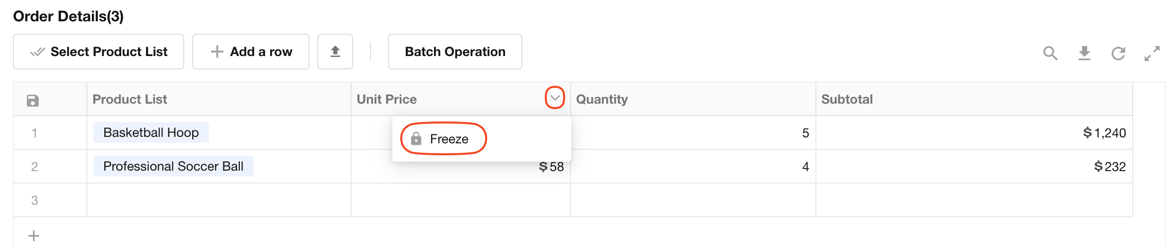 Subforms support column freezing, with a maximum of 10 frozen columns.