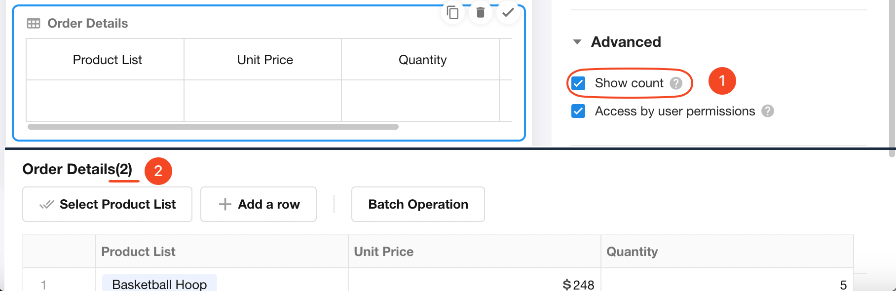 When "Show count" unchecked, the row count will not display next to the subform field name.
