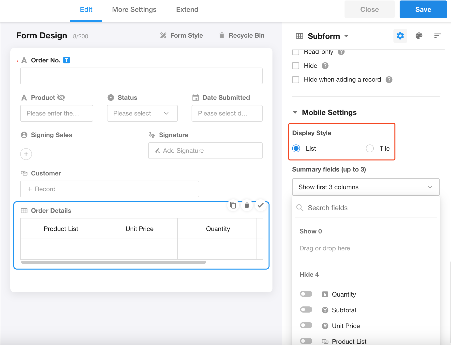 For subforms with large datasets, choose between: paginated display (load more via pages) and scrolling display (load more via vertical scroll).