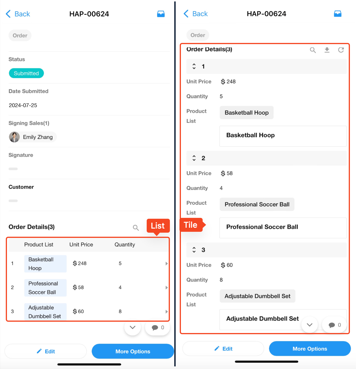 For multiple product items in a sales order: the main worksheet is the sales order, while the subform contains order details.