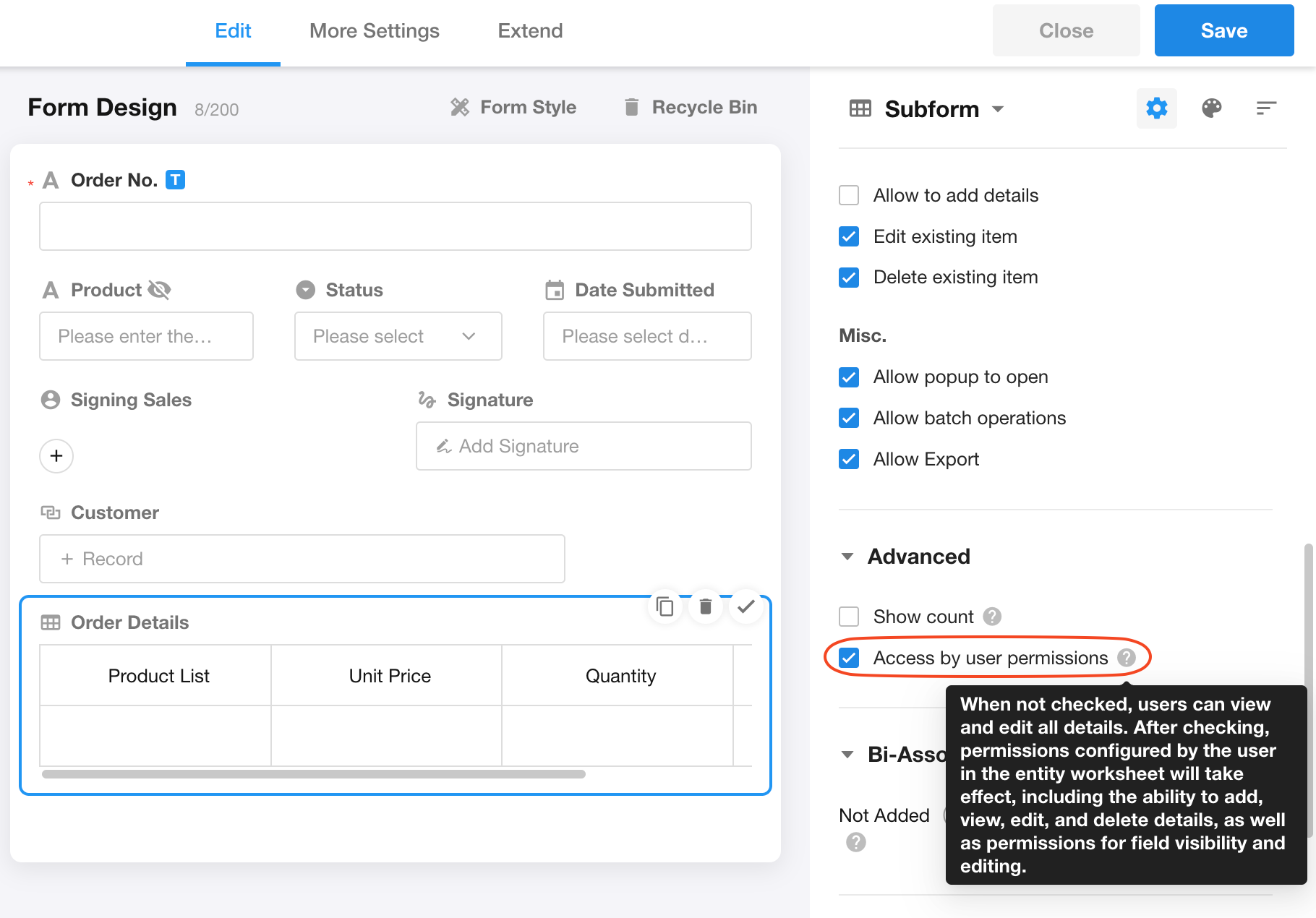 For subforms that reference physical worksheets, checking the "Access by user permissions" option will enforce the user's role-based permissions from the referenced worksheet when editing subform data.