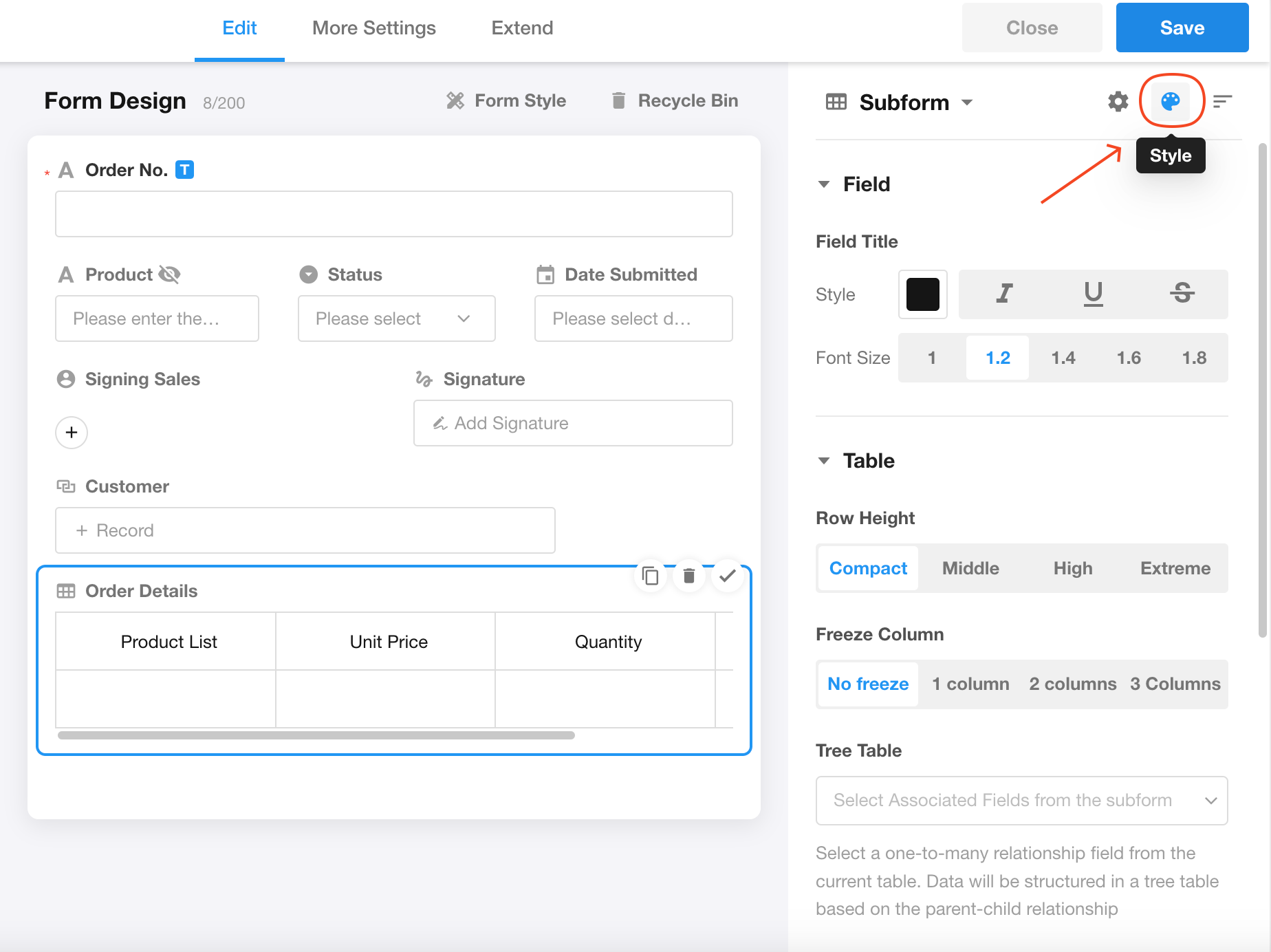 Click the "Style" button to configure subform display settings, including row height, column width, frozen columns, maximum height, and more.