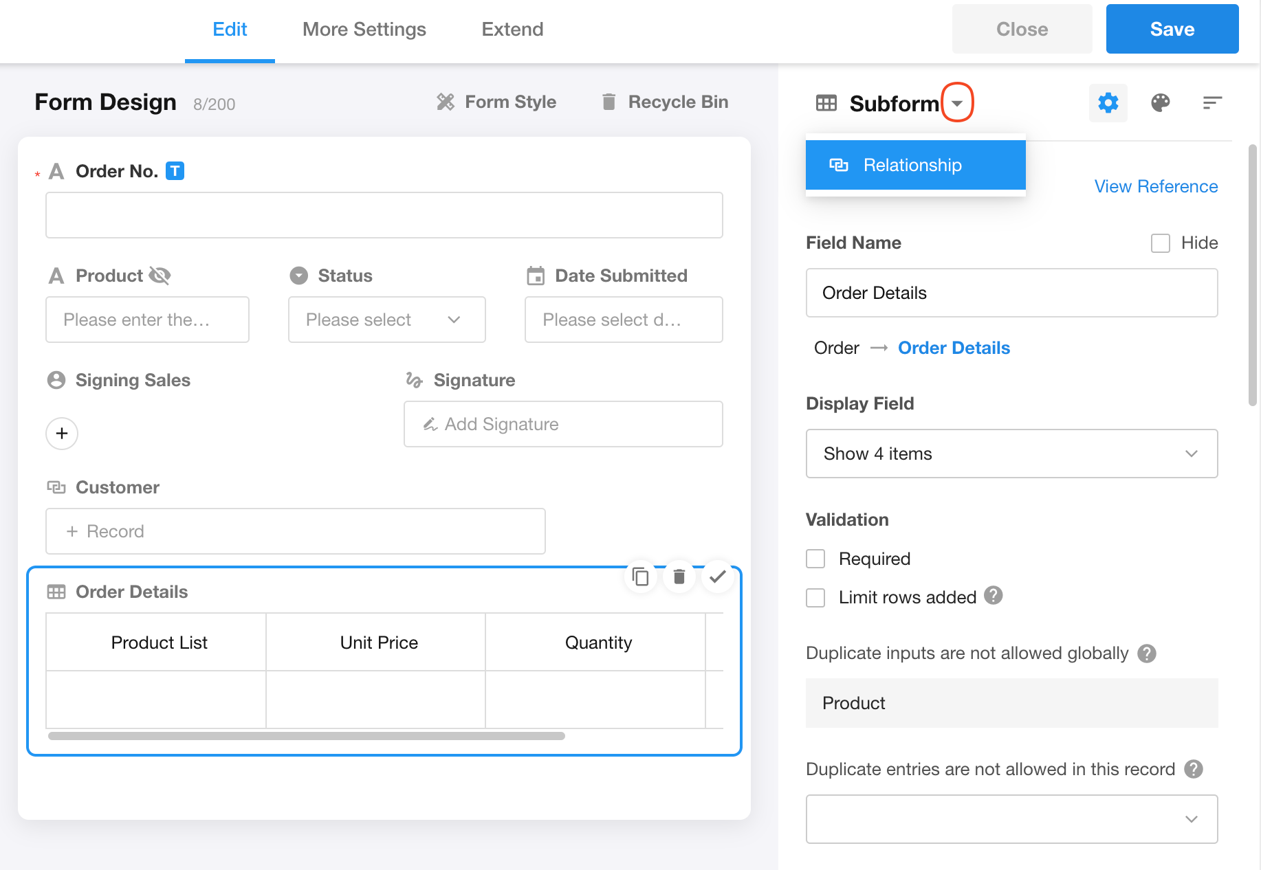 When filling out forms, users sometimes need to enter multiple sets of list-type data. While the number of entries may vary, these data entries all belong to the same category of business data. A subform field can be created to standardize this data entry process.