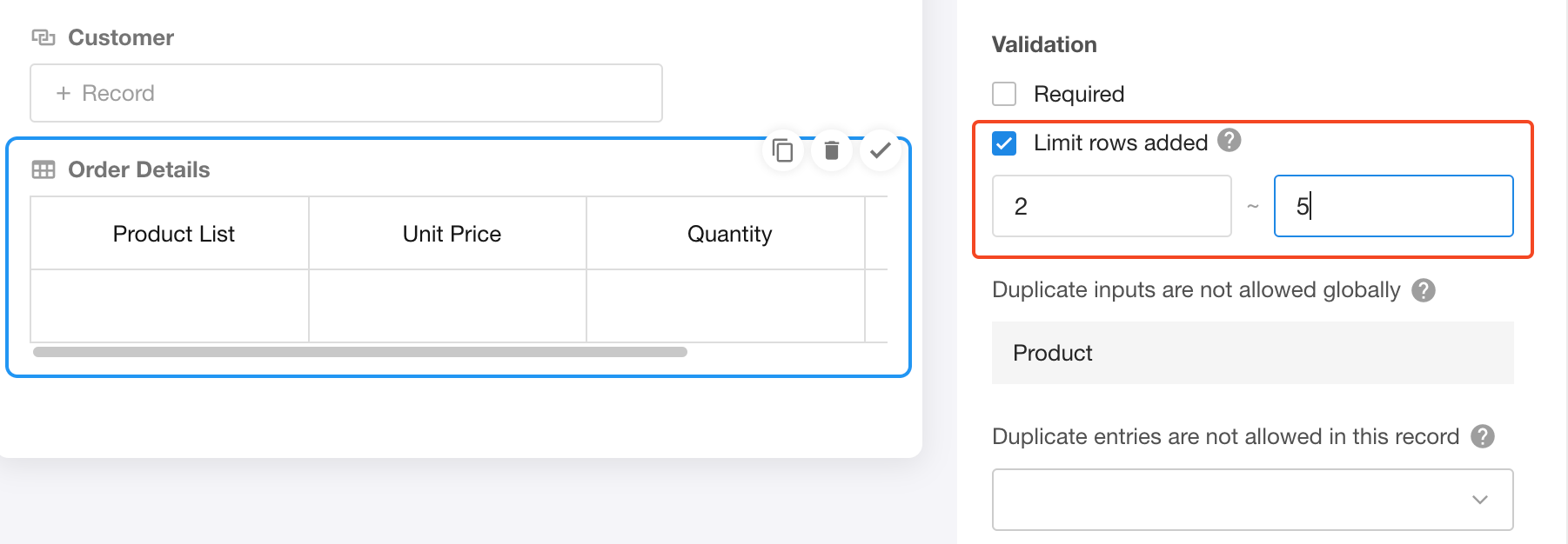 As shown above, the subform is set between 2-5 rows. When adding or deleting subform data, the row count must remain within this range to save successfully. If there are fewer than 2 rows, the system will prompt that at least 2 rows are required. When there are 5 rows, the "Add a row" button becomes unavailable.