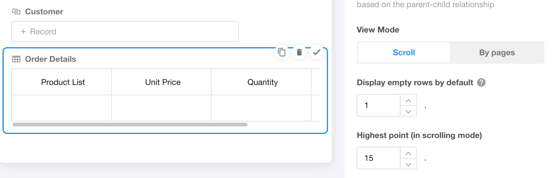 Set a fixed display height for the subform on the record page. When exceeded, users must scroll or page to view additional data (up to 200 rows maximum).