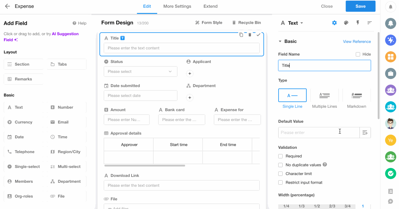 - The record title can be configured as a default combination of field values, such as "Reimbursement Application Submitted by XXX". Users can click to modify this if needed.