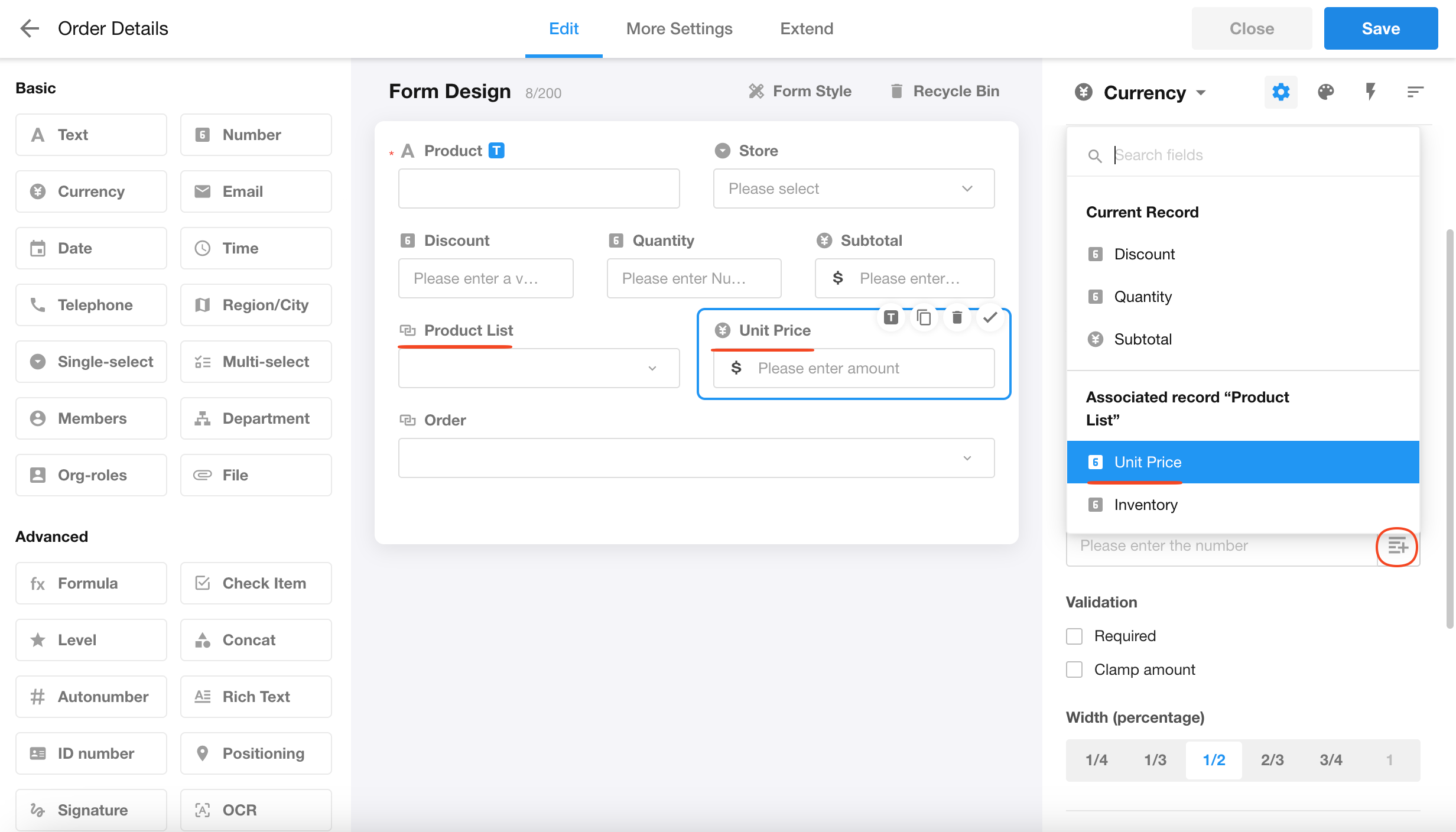 A field's default value can be set to either another field value within the current worksheet, or a field value from a related record. During both record creation and editing, these default values will dynamically update when the referenced field values change.