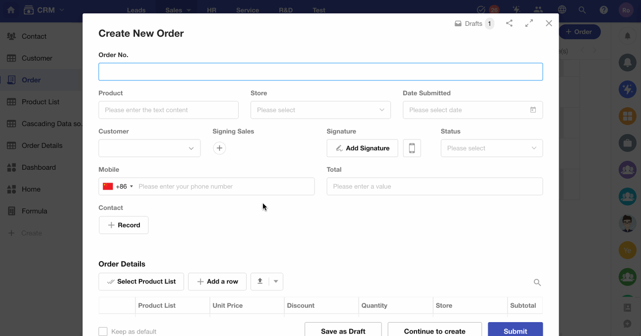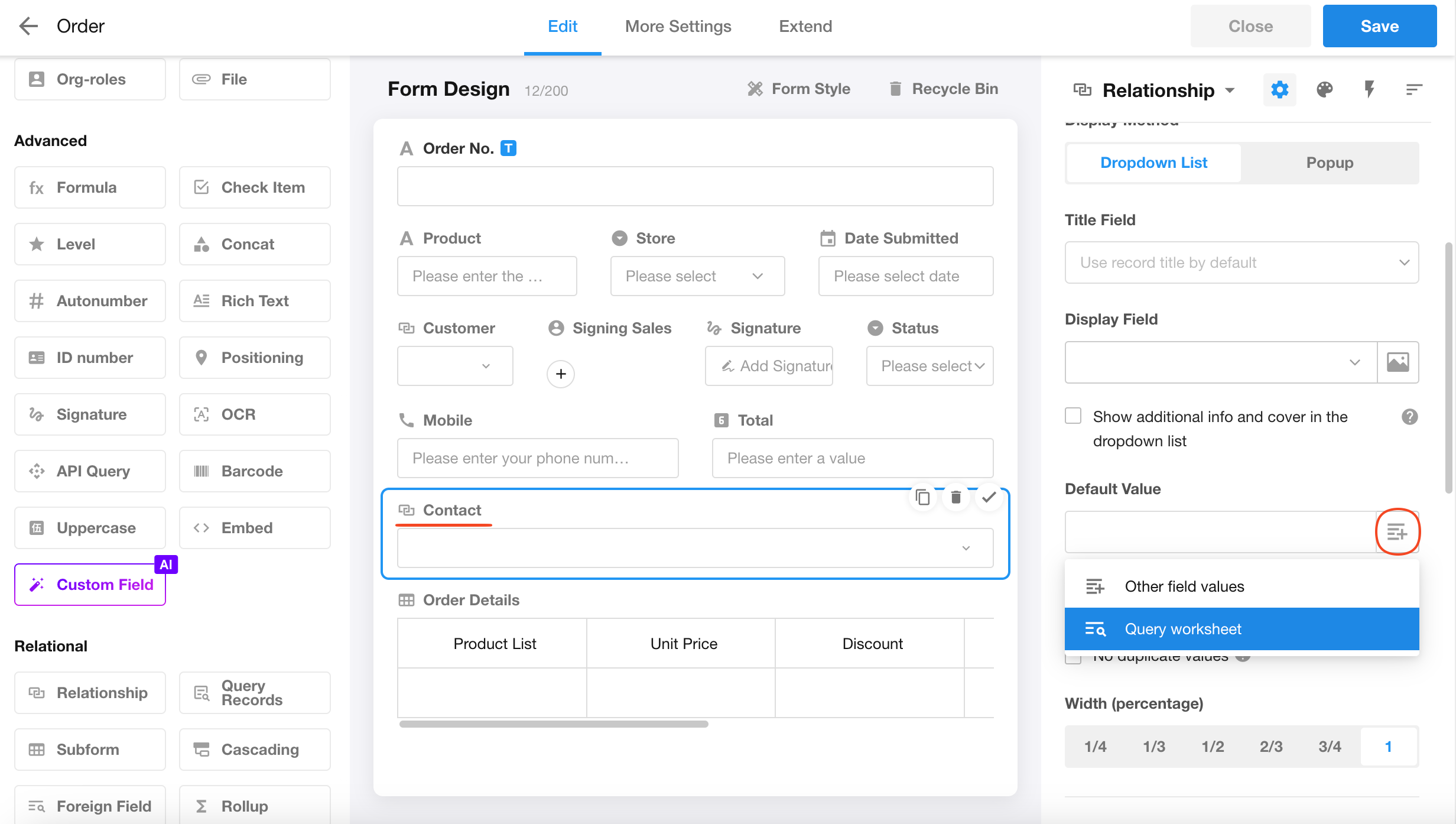 When creating a new order, if the user enters a phone number, the system can query the Contacts worksheet to find the matching contact. If found, the related contact record will be automatically linked to the current order.