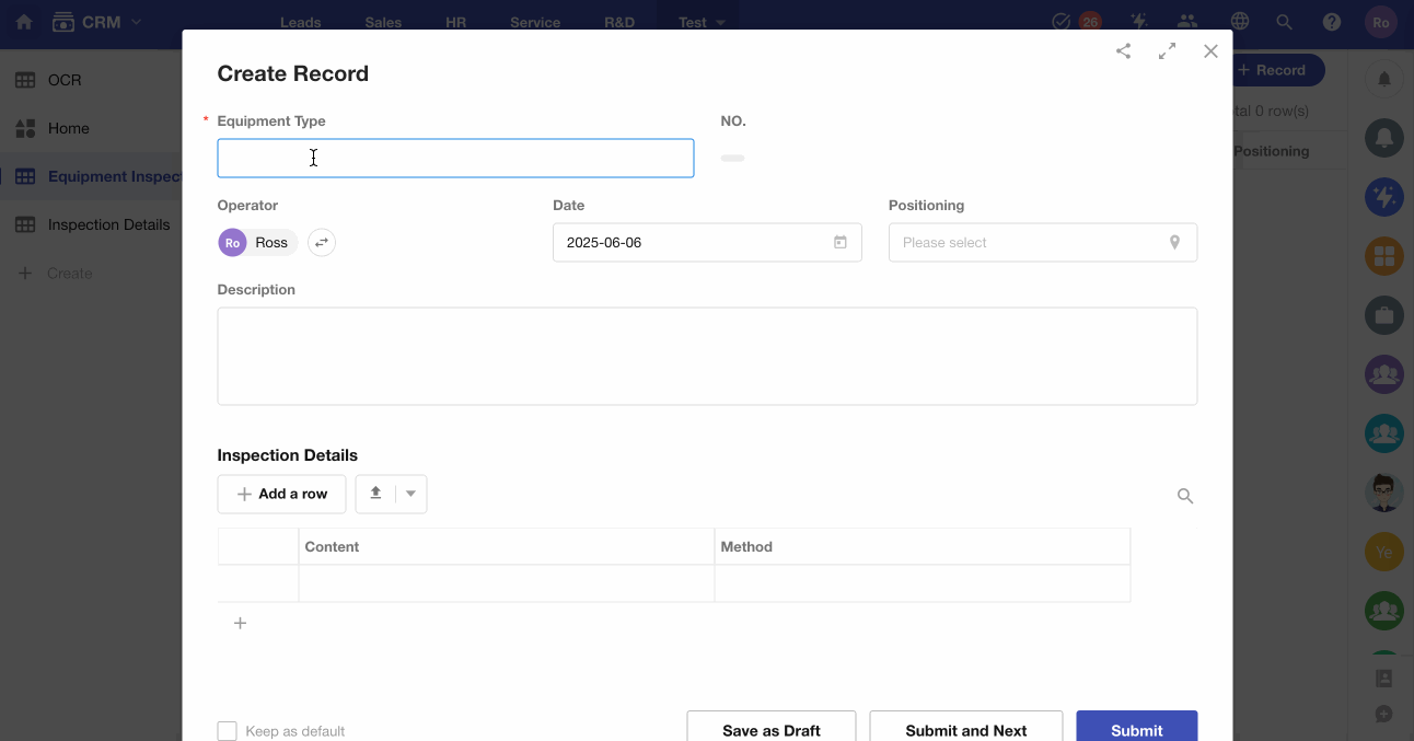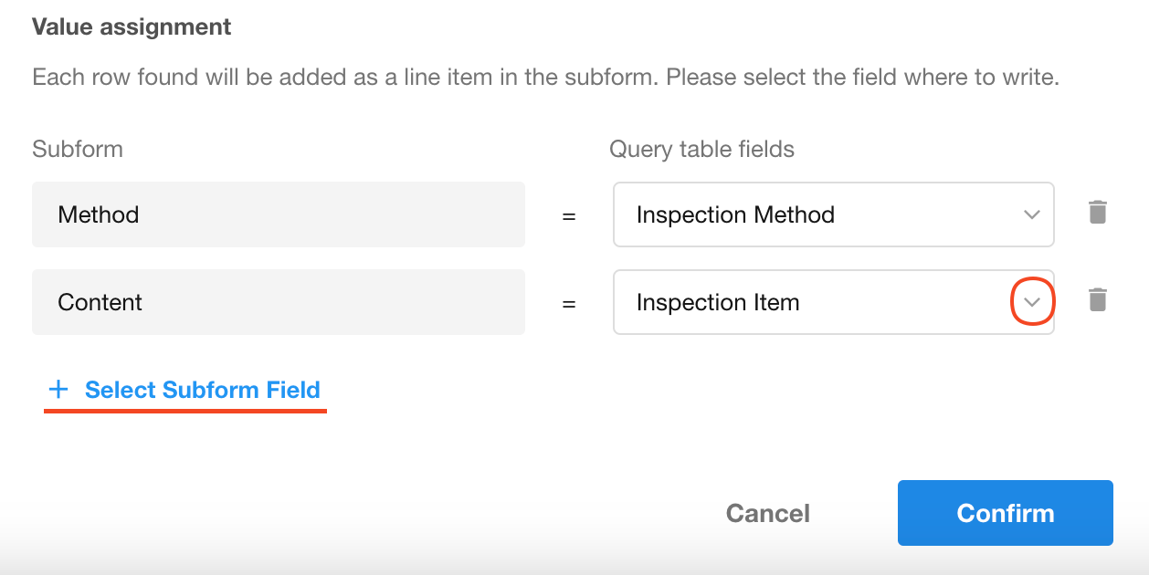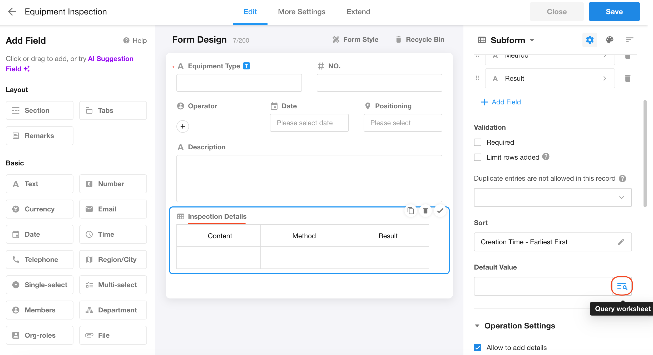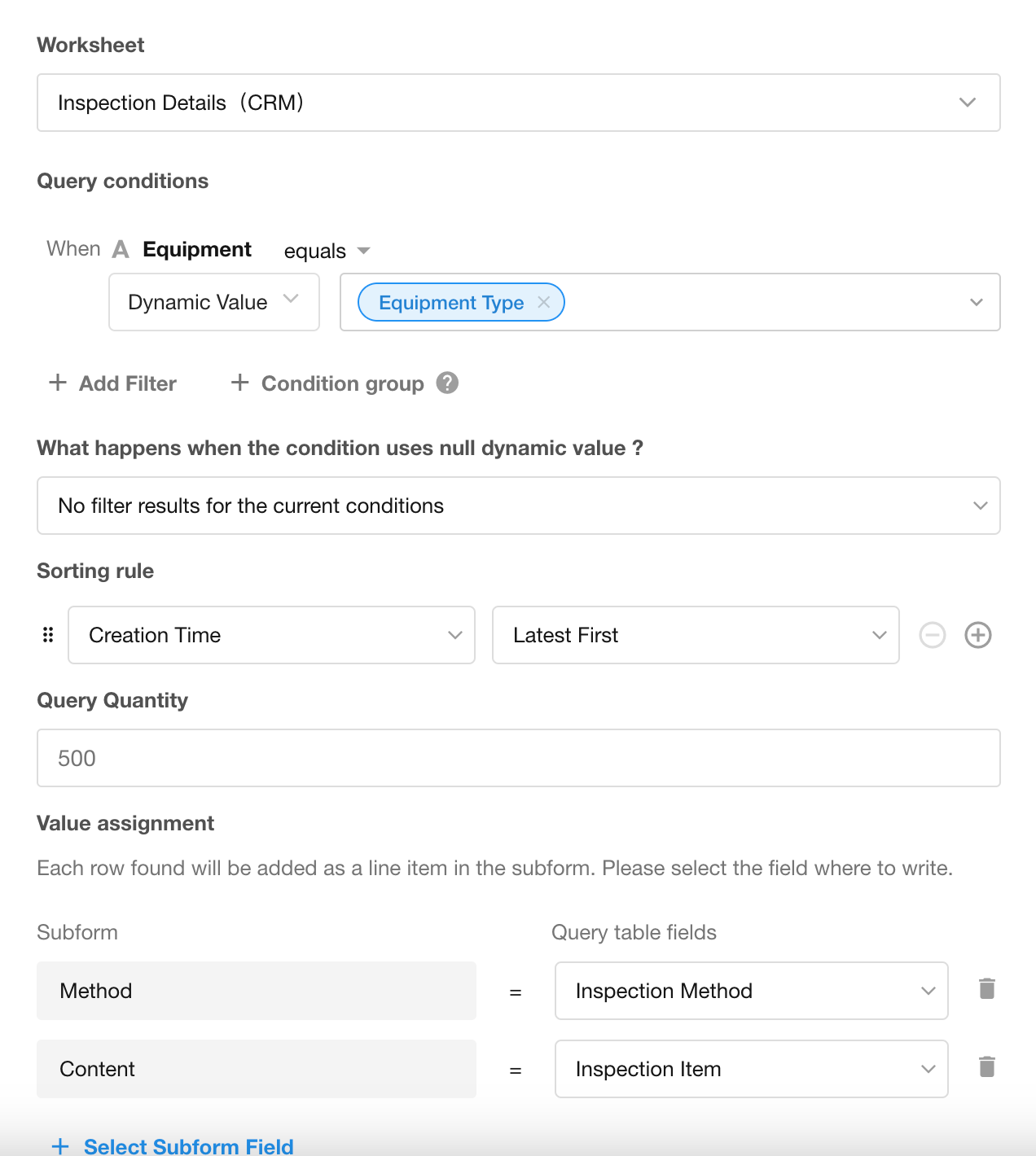 During equipment inspections, when creating a new inspection record, once the equipment name is entered, the system can query a inspection details worksheet containing inspection items and methods. The matched results (multiple rows) will then be automatically written into the "Inspection Details" subform of the current record.