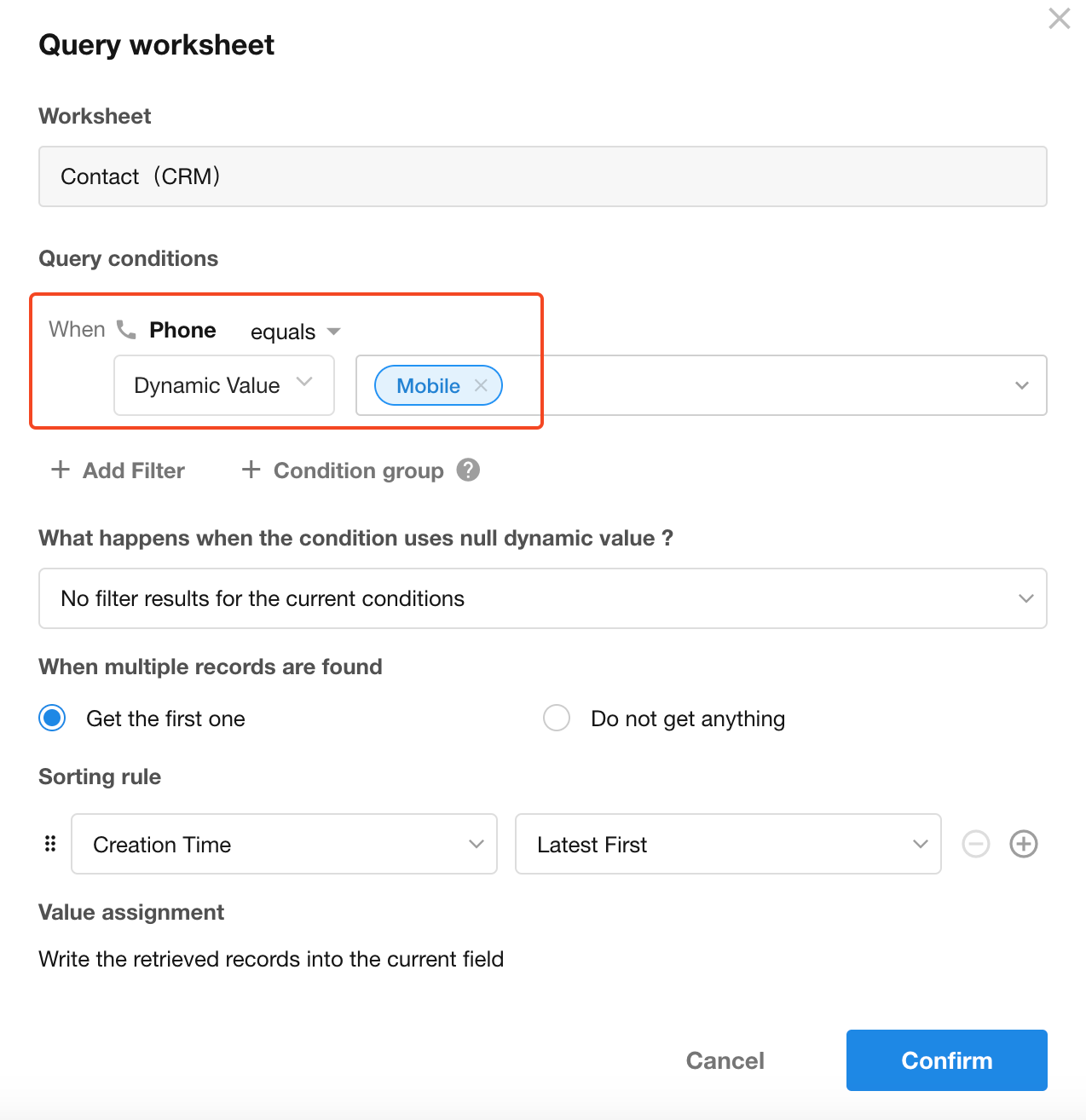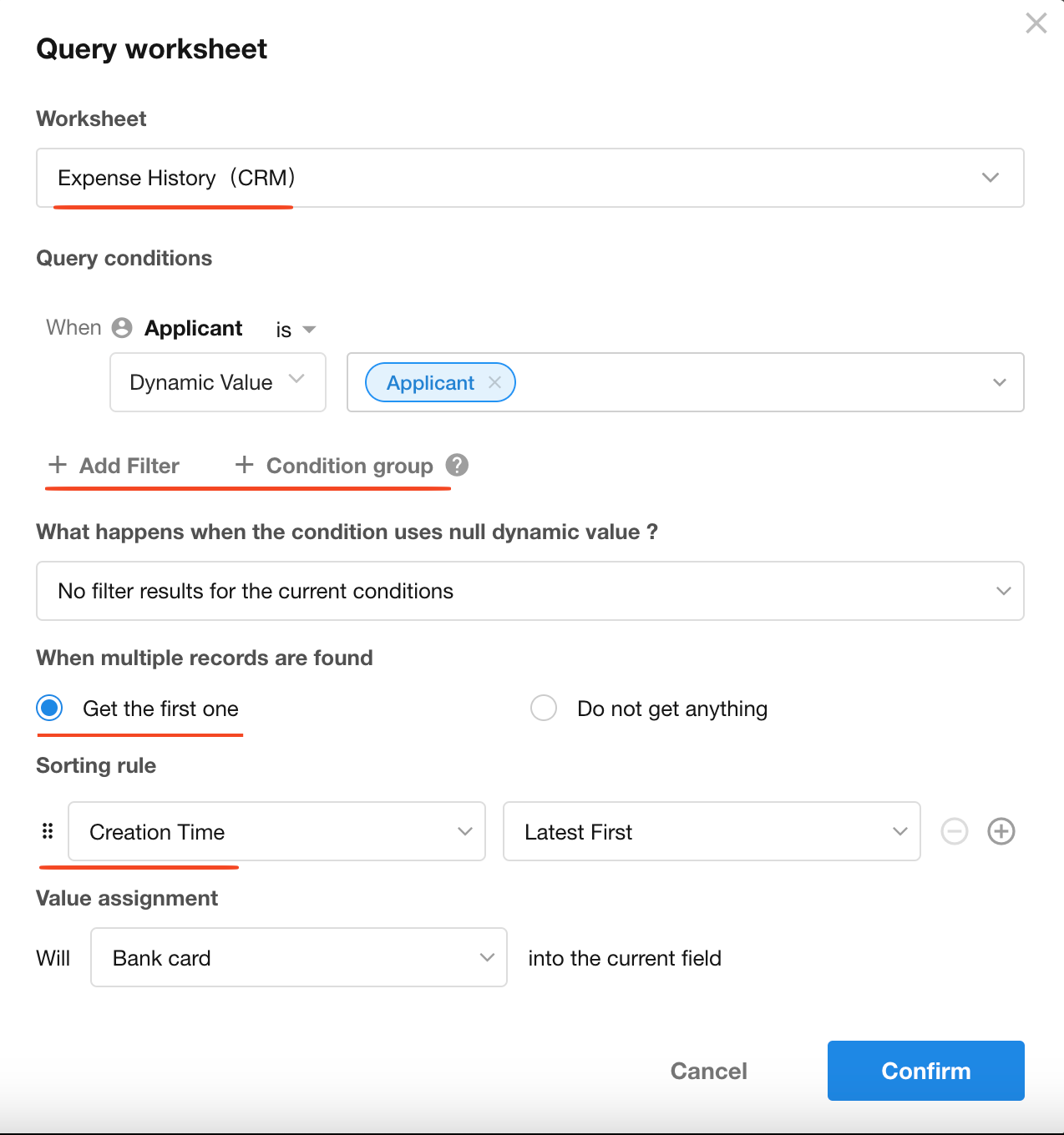When creating a new record, if relevant data already exists in the current worksheet or another worksheet, you can query a worksheet based on specific conditions and populate field values from the result.