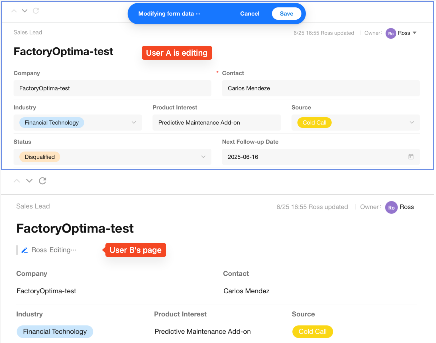 Blocks other users' editing attempts through record detail pages, custom actions (Fill in), interface pushes (Fill in).
