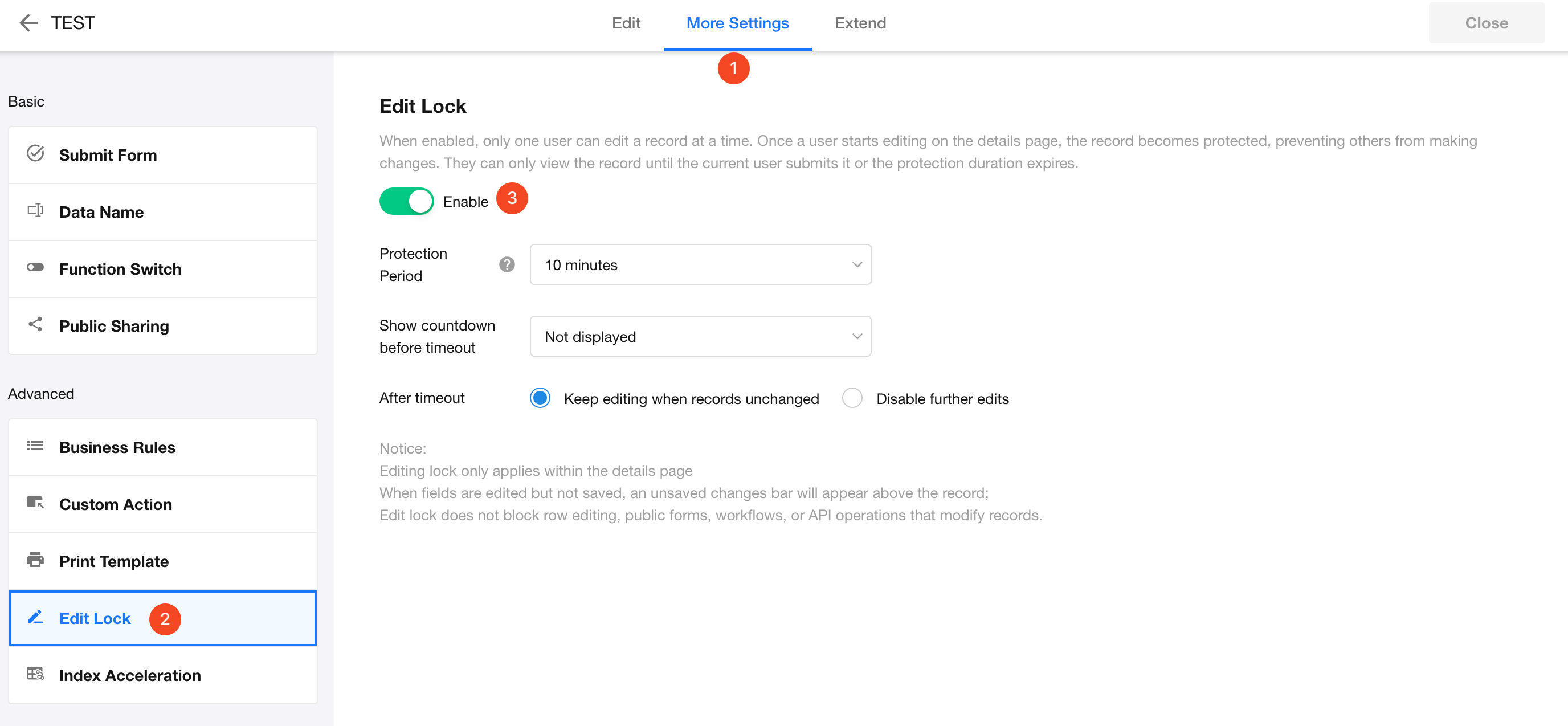 The application administrator can go to [Edit Form] > [More Settings] > [Edit Lock], to enable the "Edit Lock".