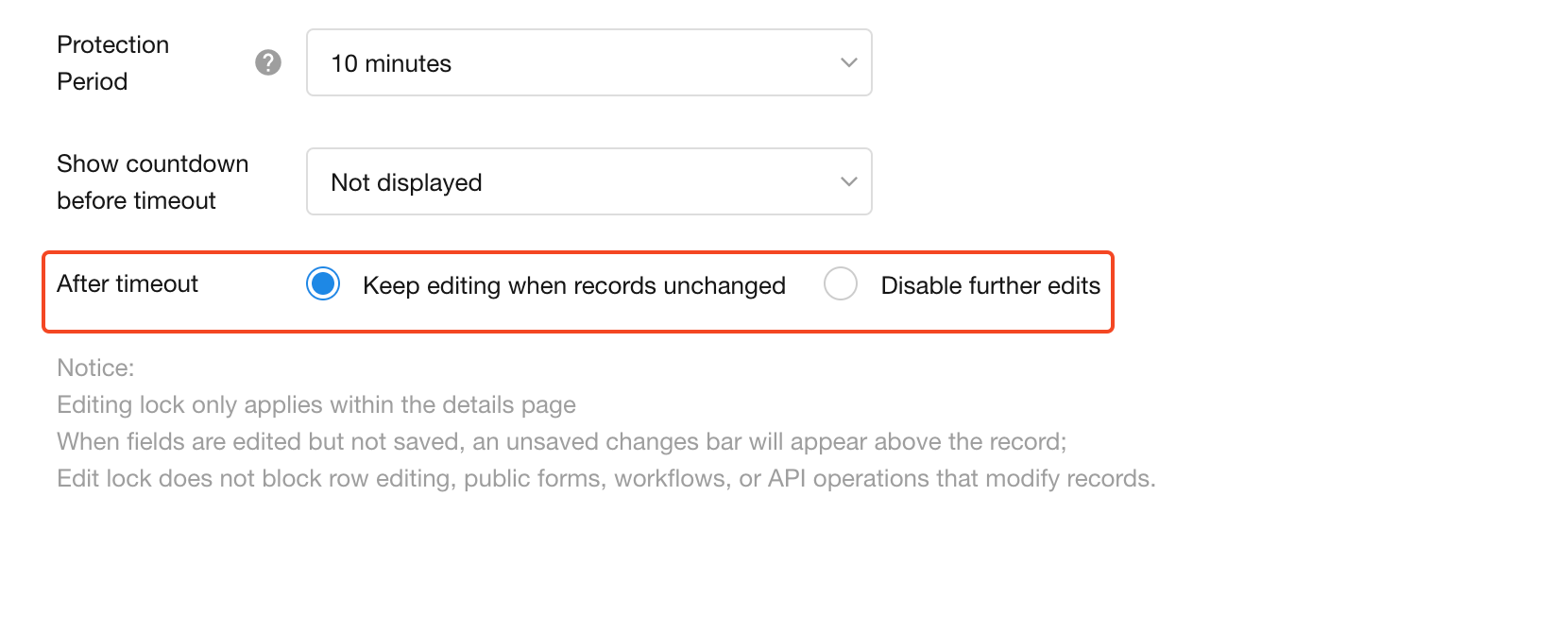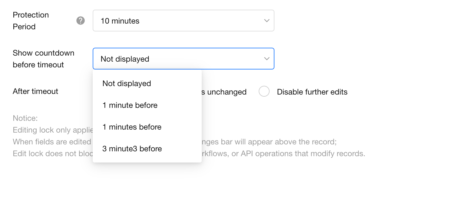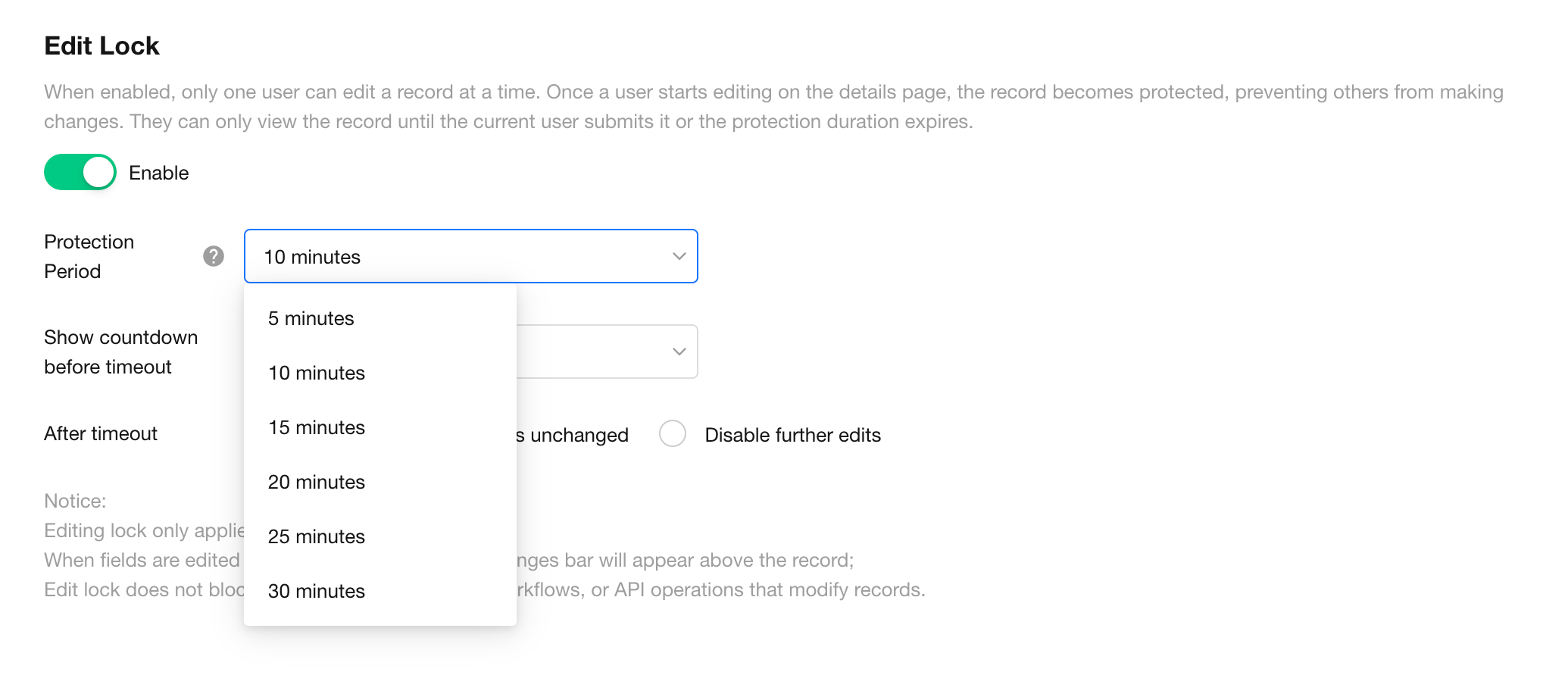 Protection period refers to the time period in edit lock mode after which, if there is no operation, the edit lock mode will automatically exit, allowing other users to edit the record. The minimum protection duration is 5 minutes, and the maximum is 30 minutes.