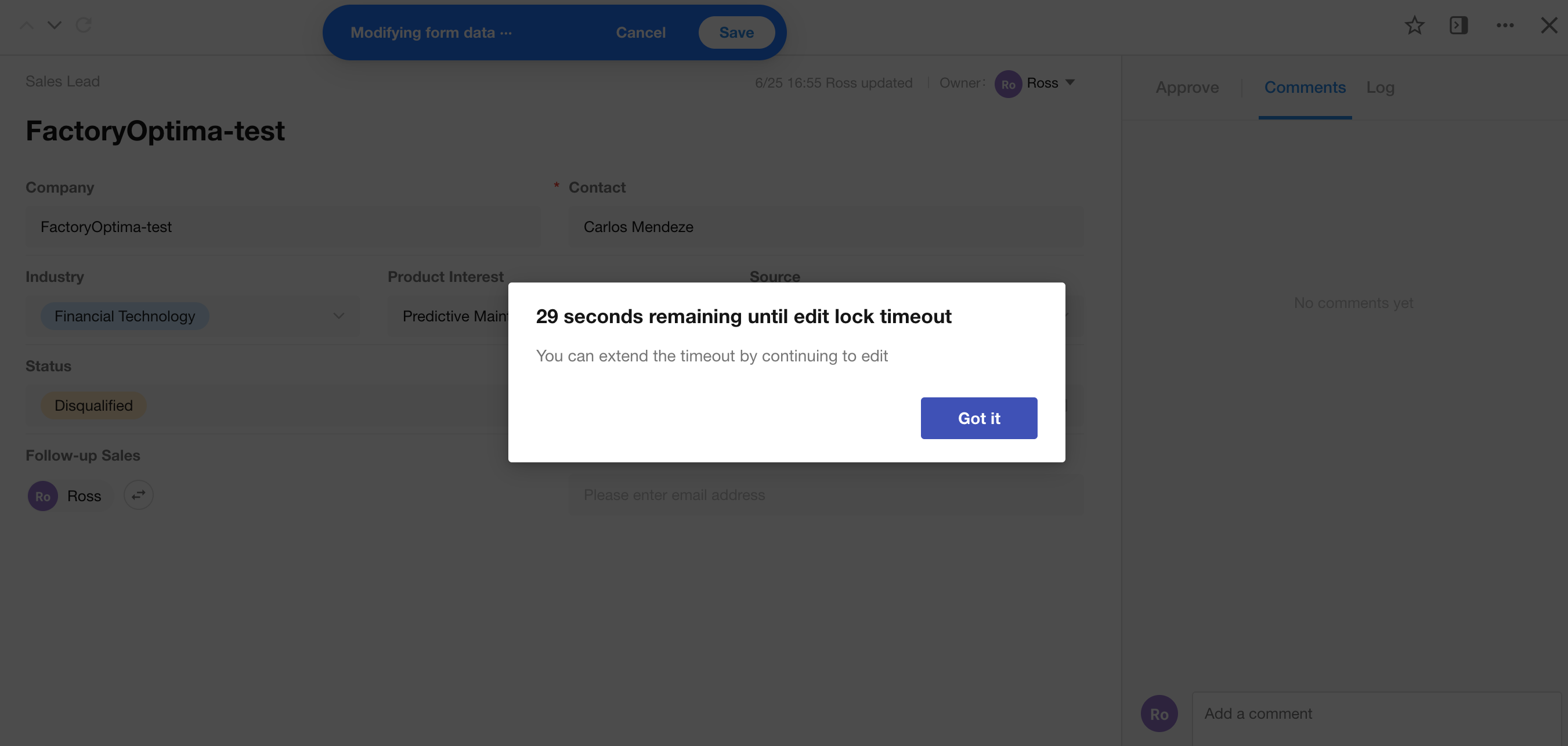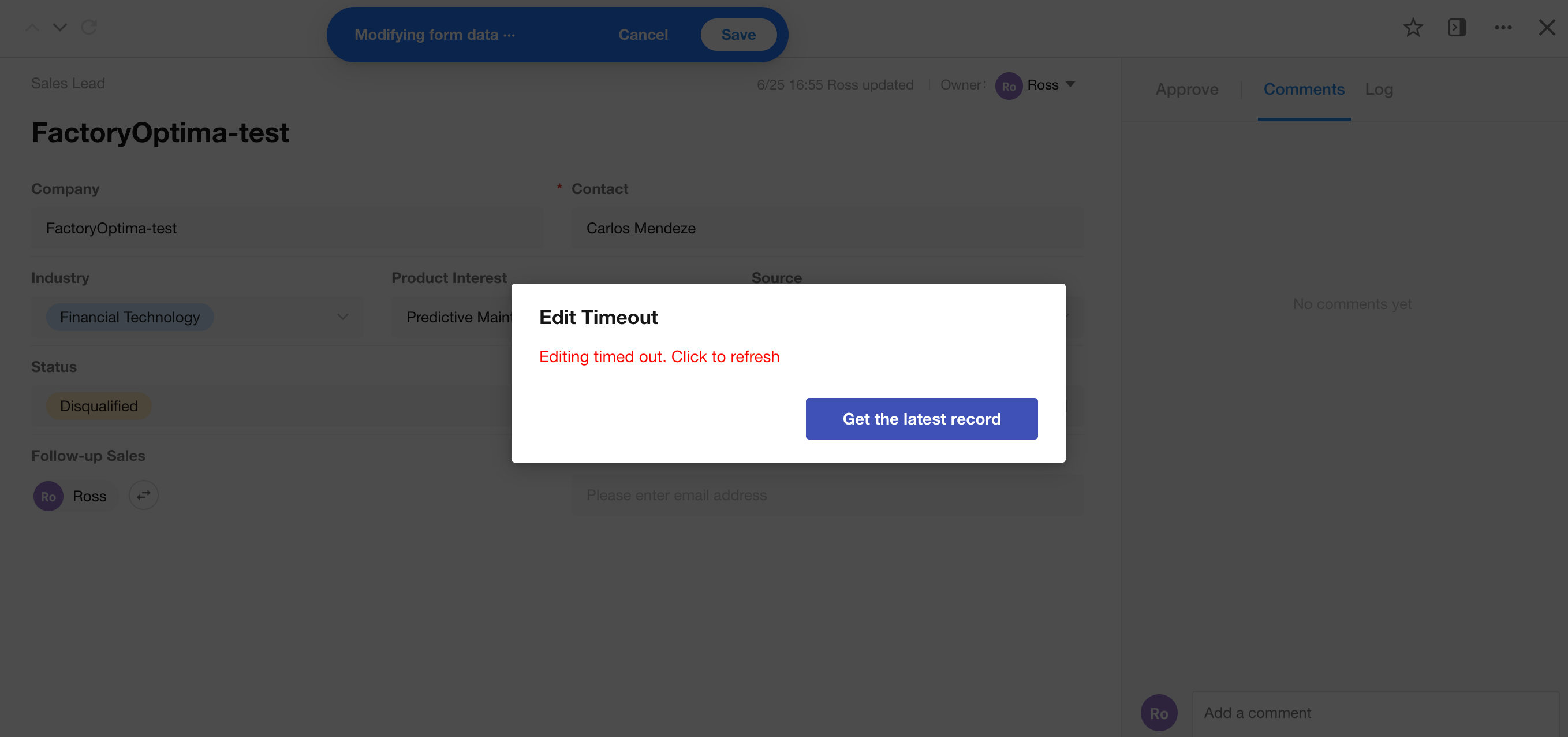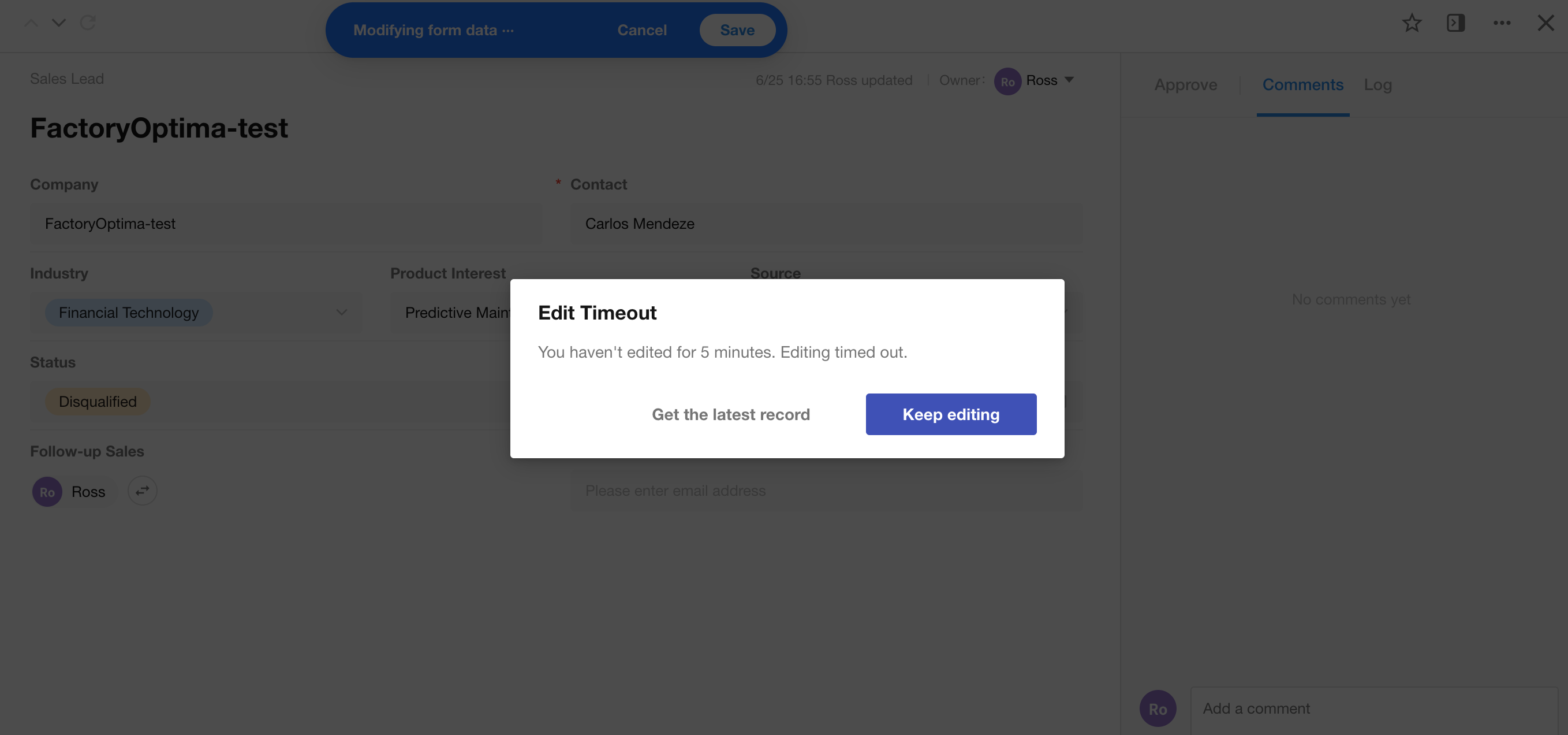 Regardless of whether the record has been changed, editing cannot be continued after timeout.