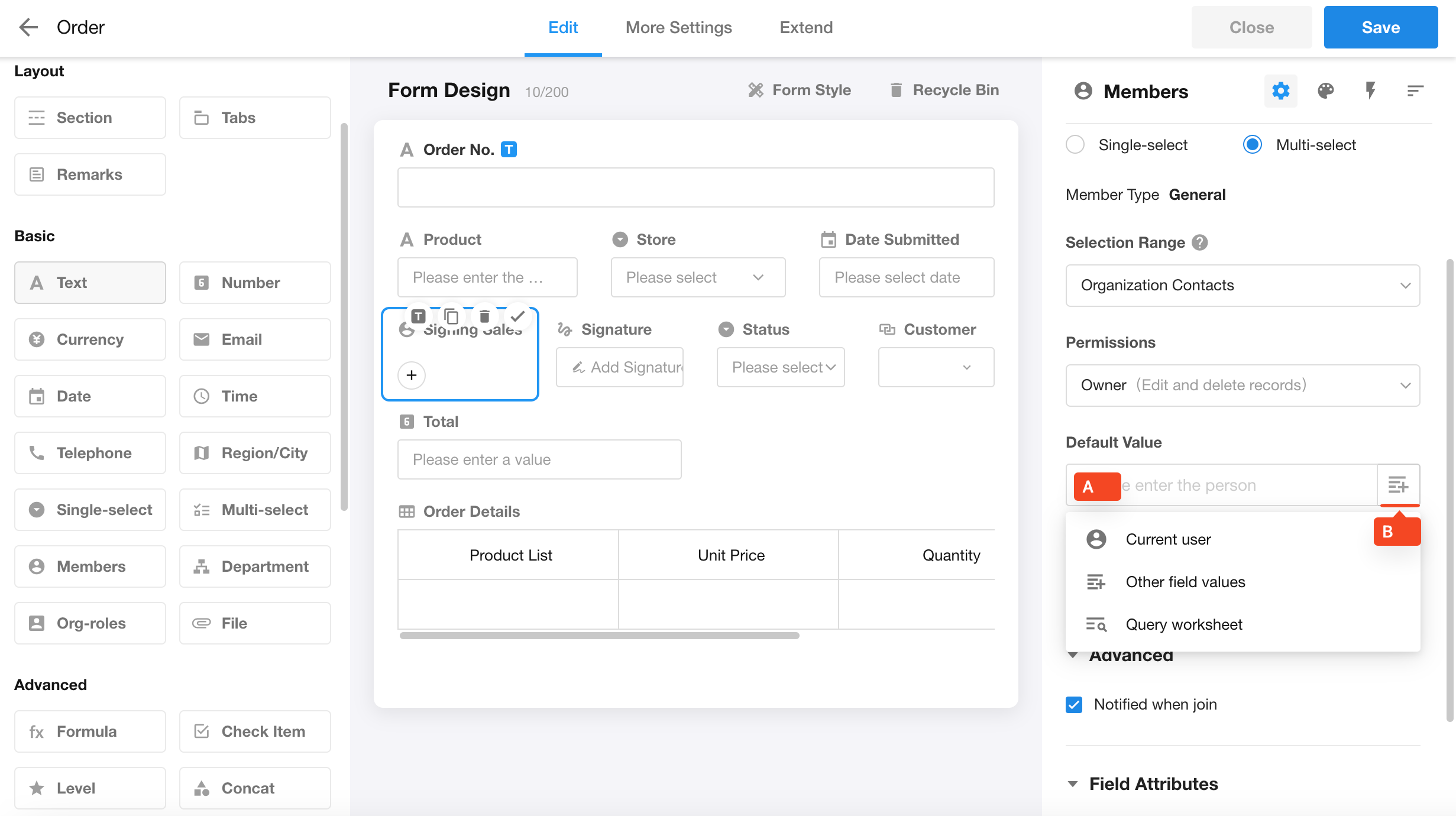 Members, Department, Single-select, Multi-select, Level, Region/City, Positioning, and Check item
