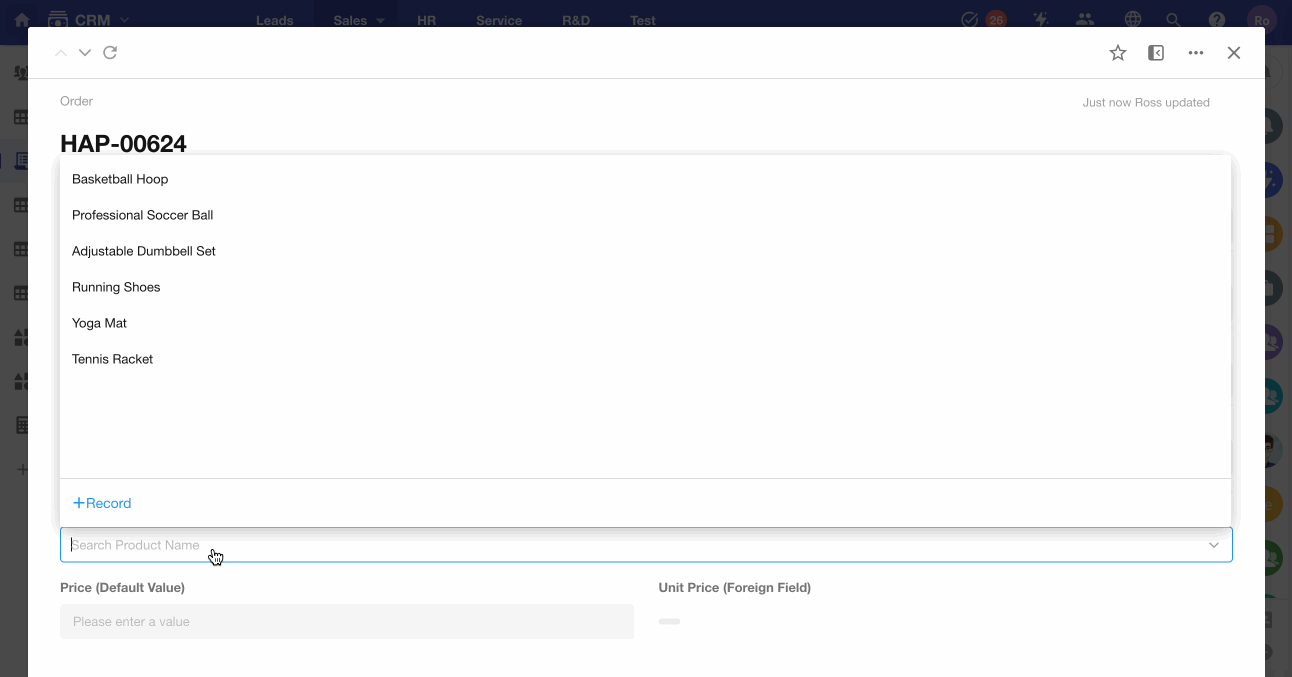 When Product A is selected (related field), the Unit Price automatically displays the price of Product A.