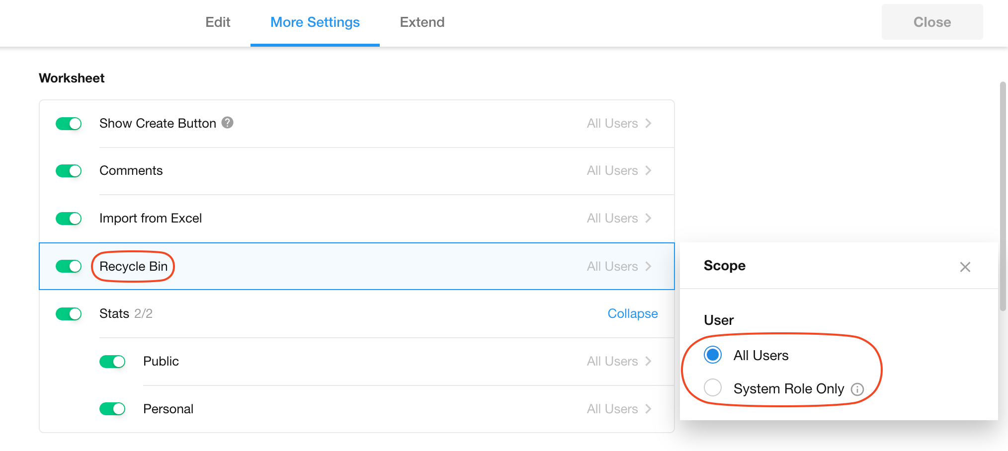 If enabled, configure whether the Recycle Bin is accessible only to App Administrators/Developers/Operators or to all users.