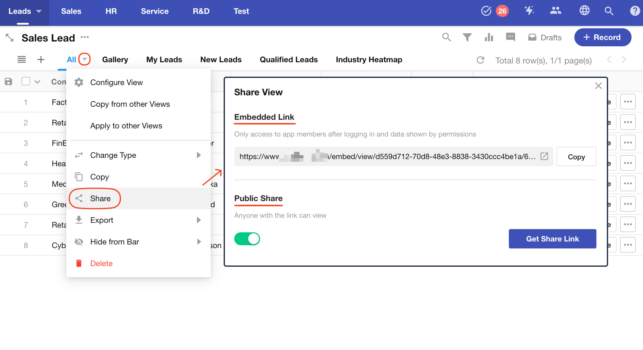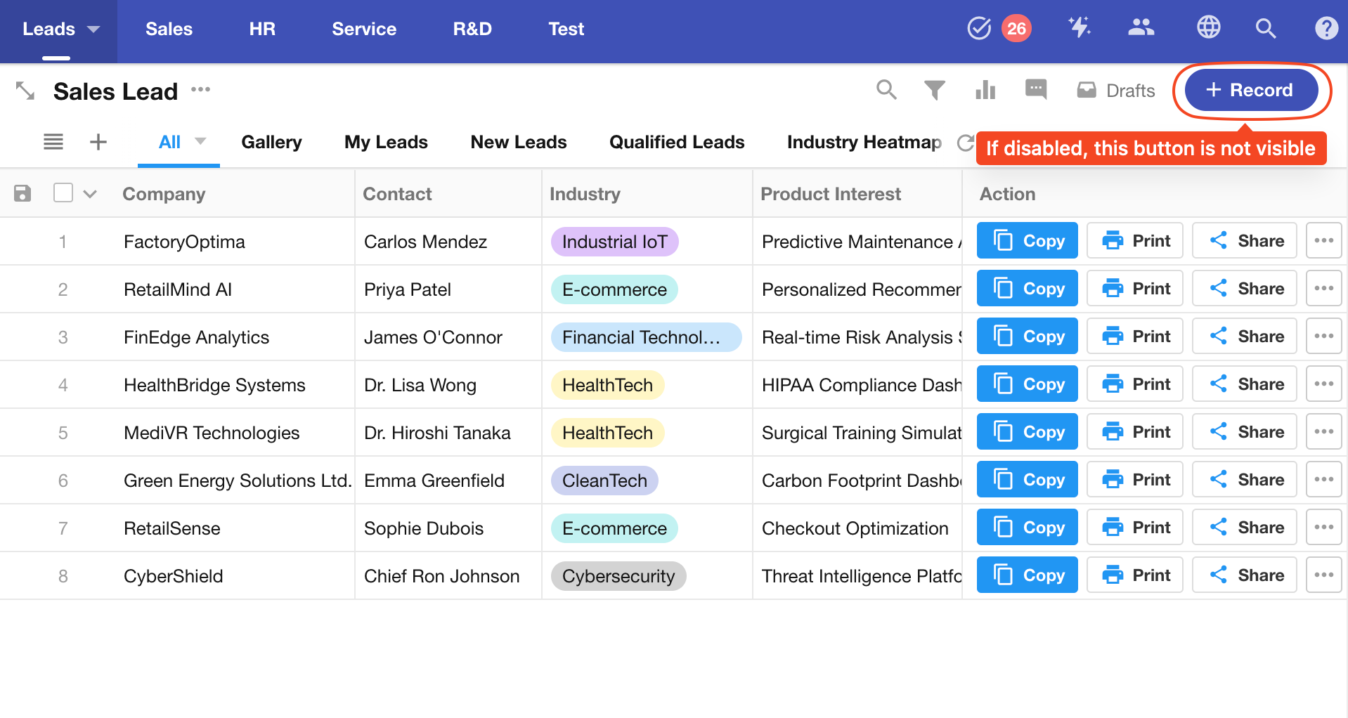 When both sharing options are disabled, the Share button in the record will be hidden.