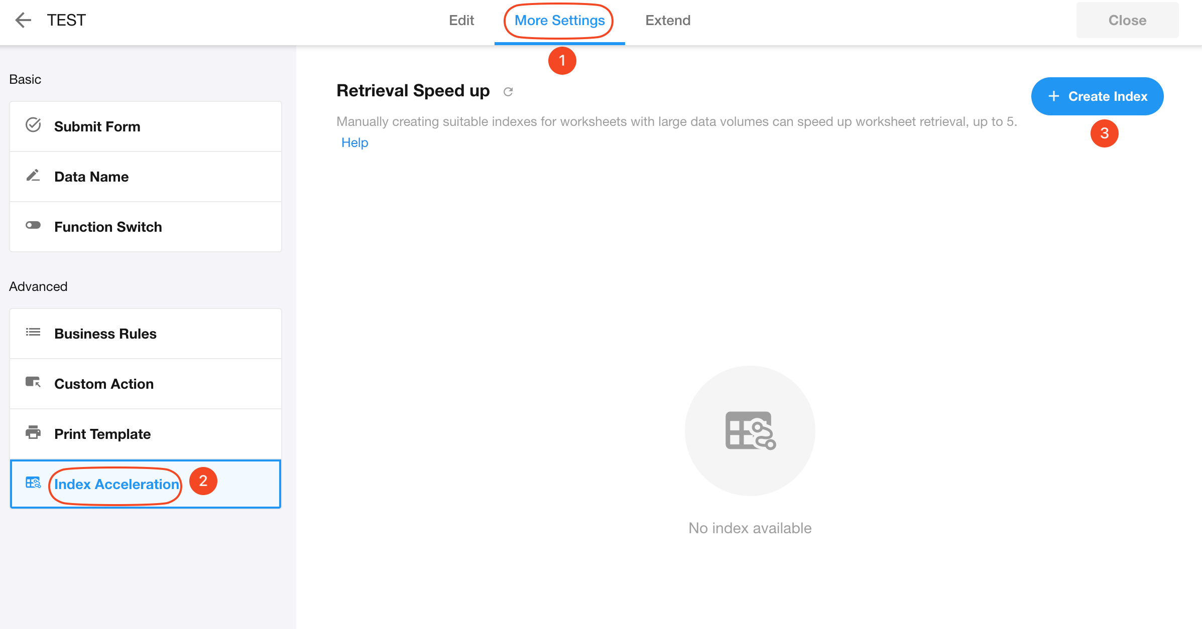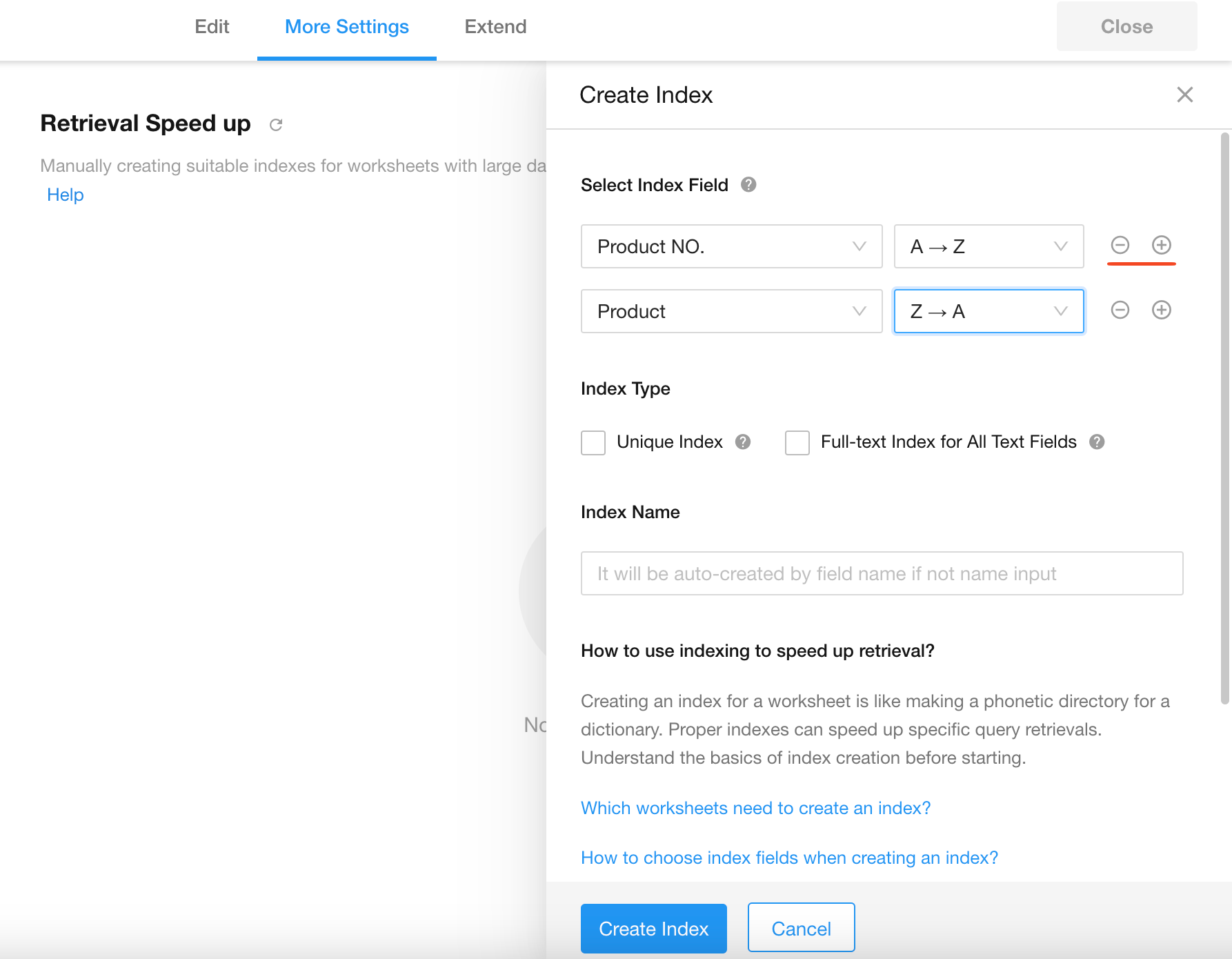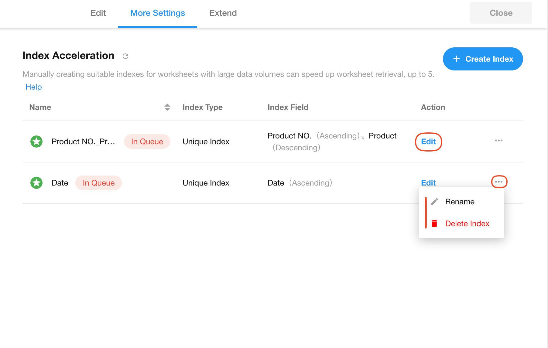 Go to worksheet editing page, then [Index Acceleration] > [Create Index].
