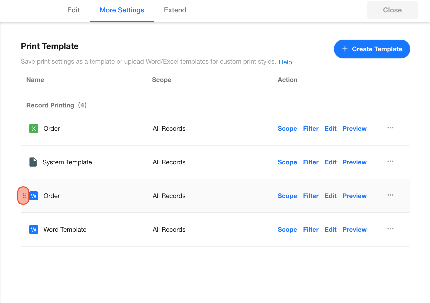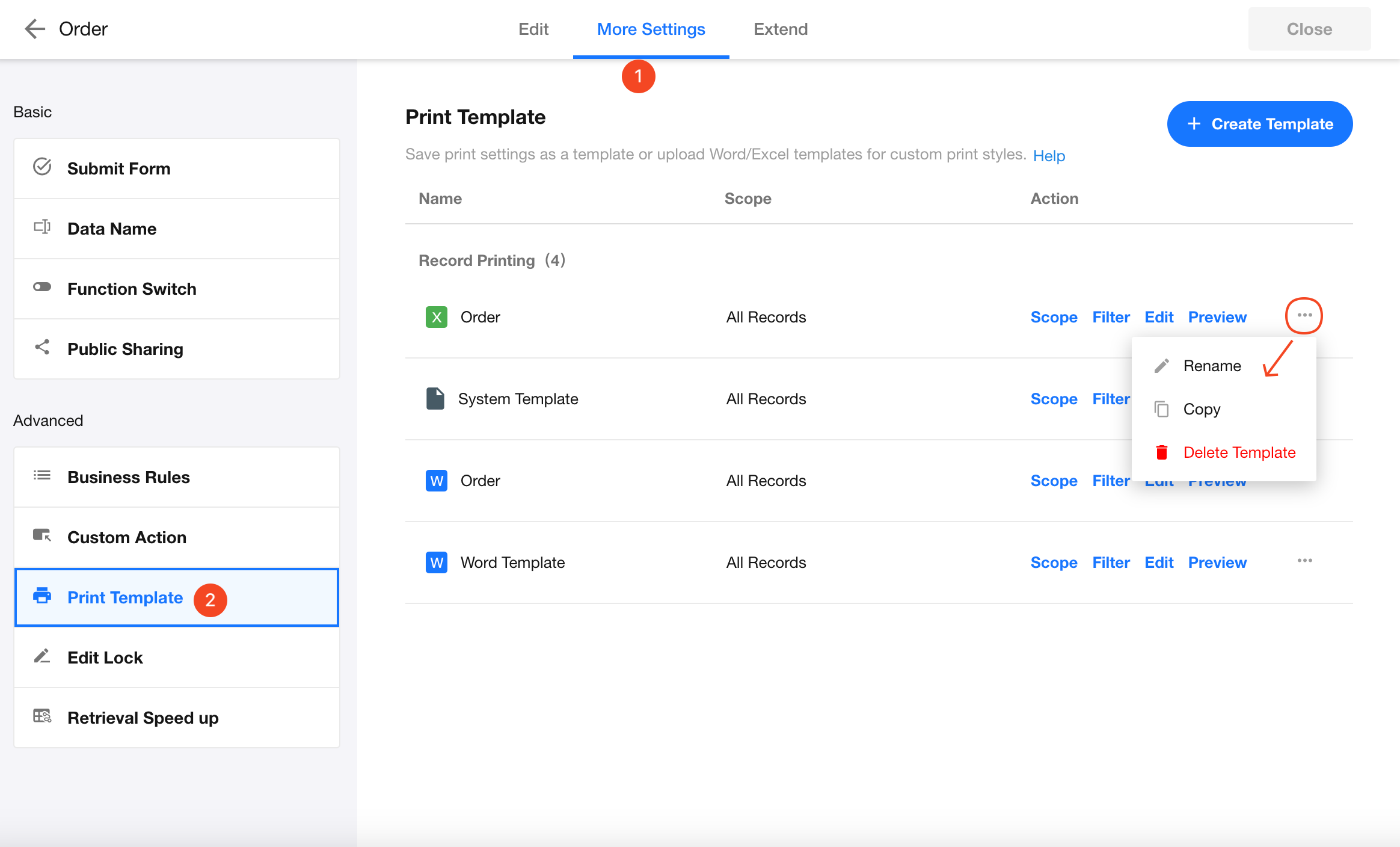 To manage existing templates, application admins can go to the form editing page and click [More Settings] > [Print Template].