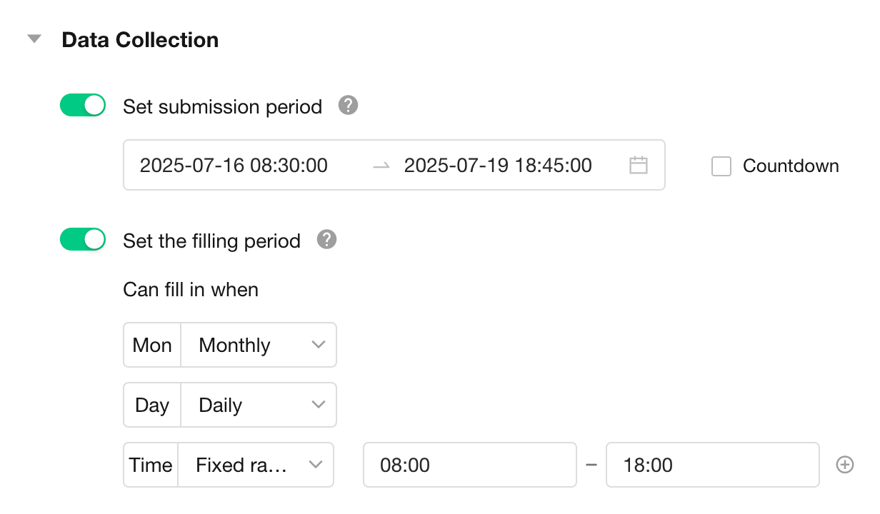 If "Countdown" is checked, the deadline on the page will display as: [Collection will end in 3 days, 2 hours, and 17 seconds]; if unchecked, it will display as: [Deadline: 2023-08-10 20:00].