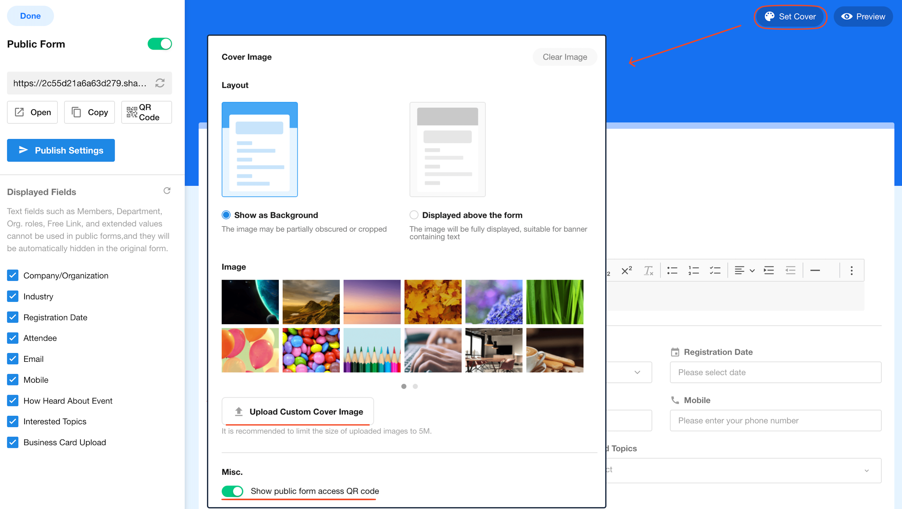 The cover settings include theme color, image, and whether to display QR code on the public form.