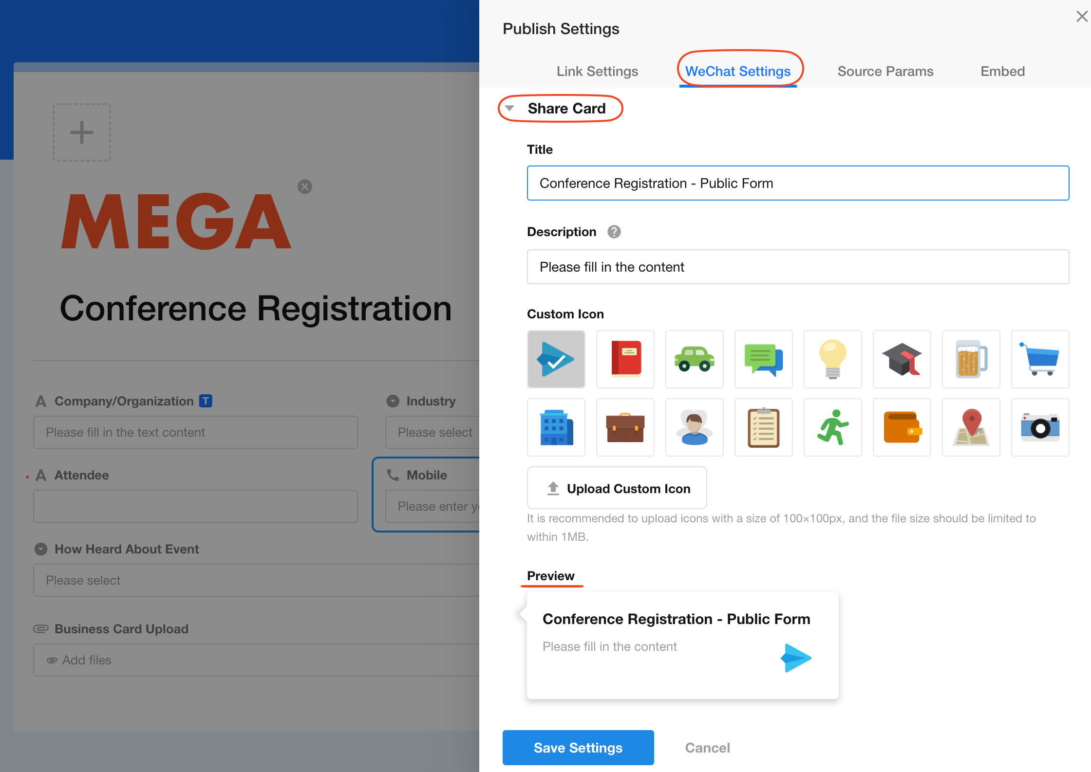 When sharing a public form in WeChat (to friends or Moments), you can customize the sharing card style (including title, description, and icon). Note that shared cards in Moments only display the title and icon.