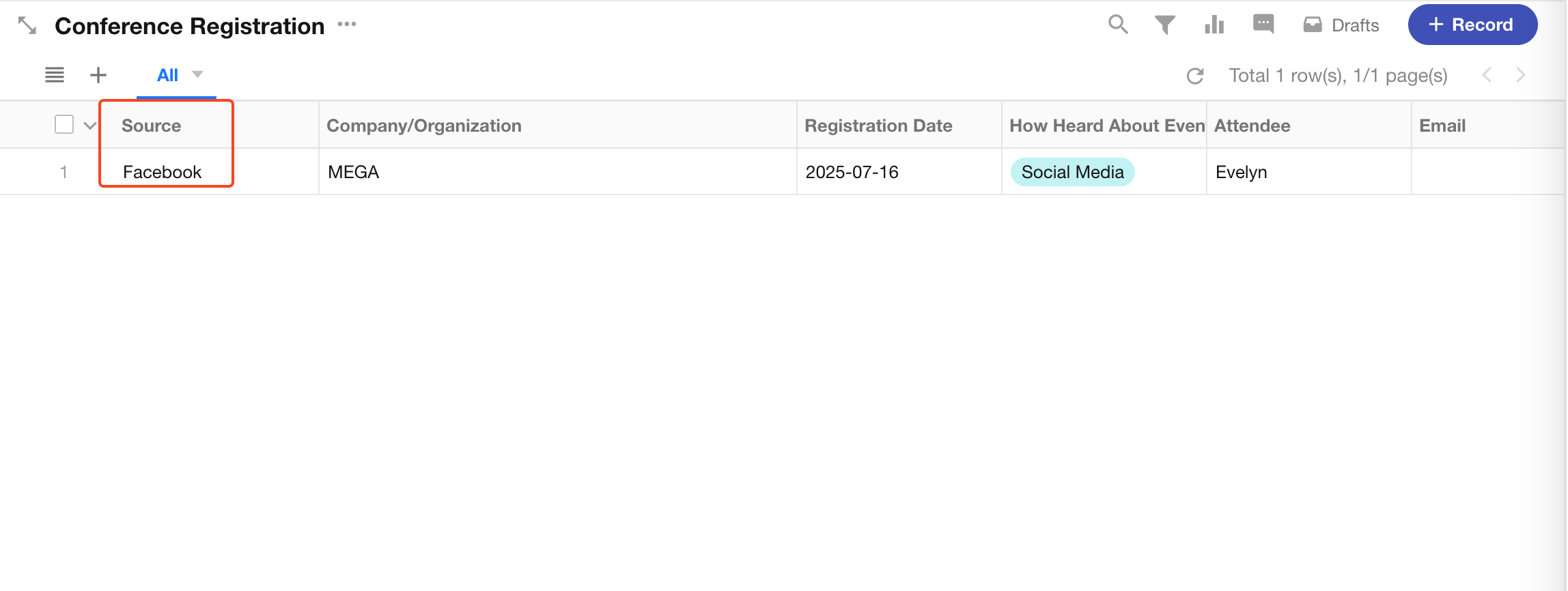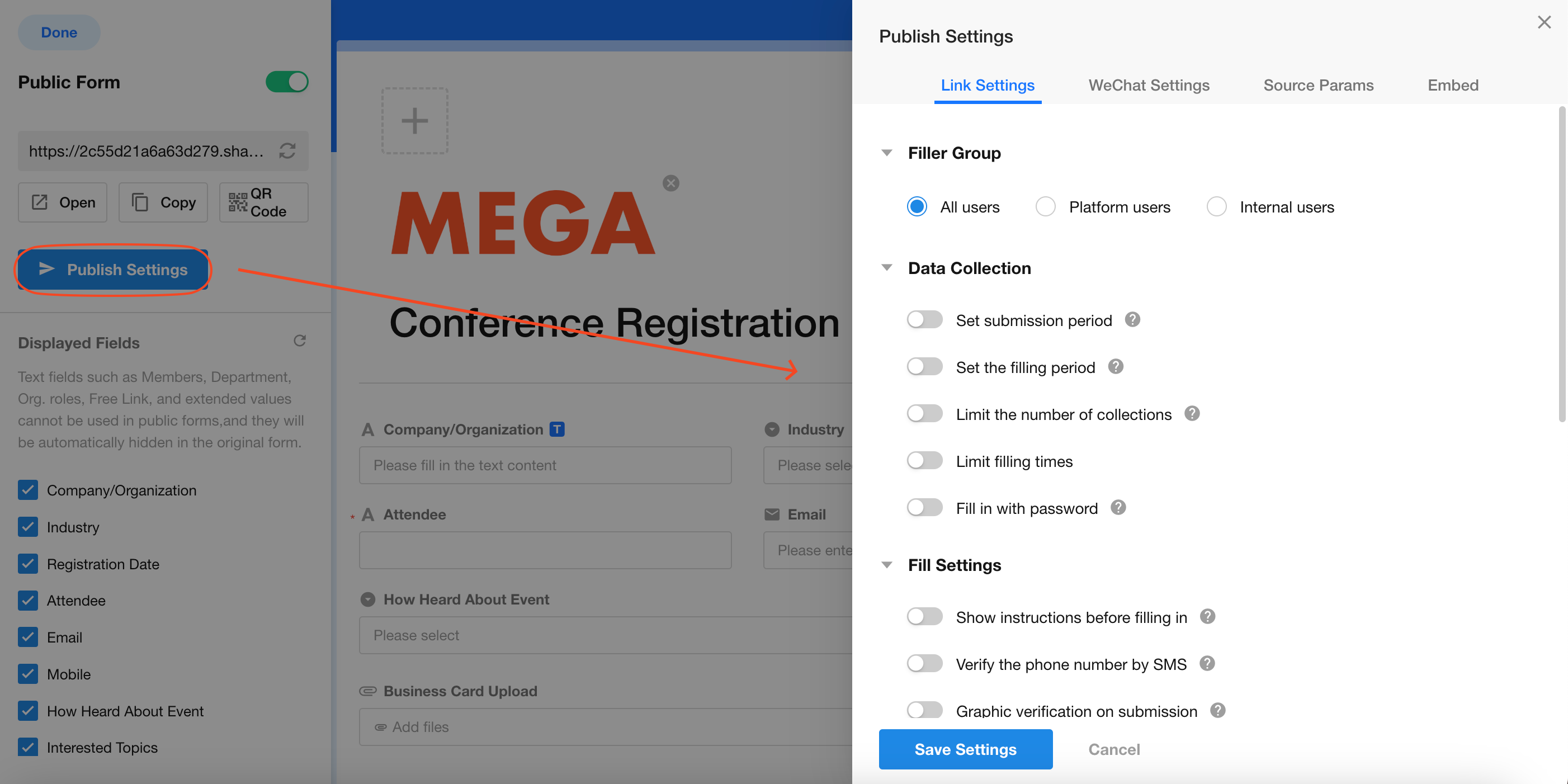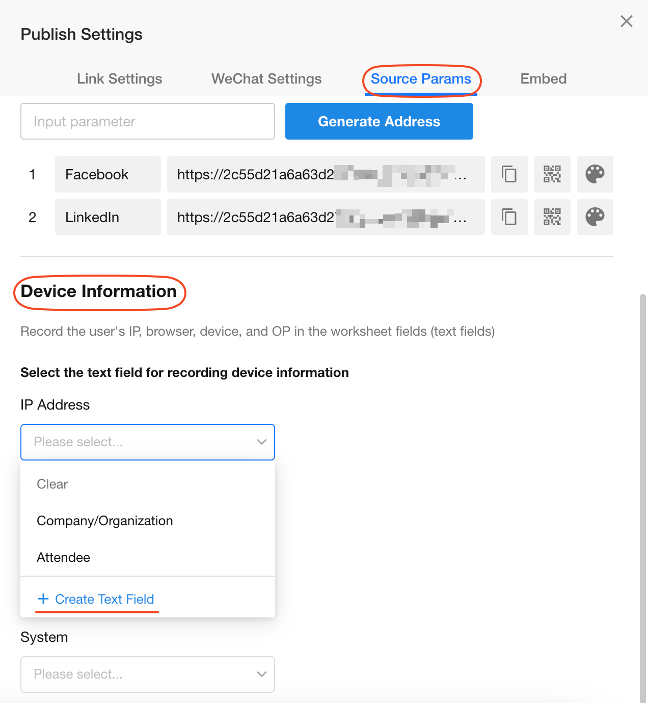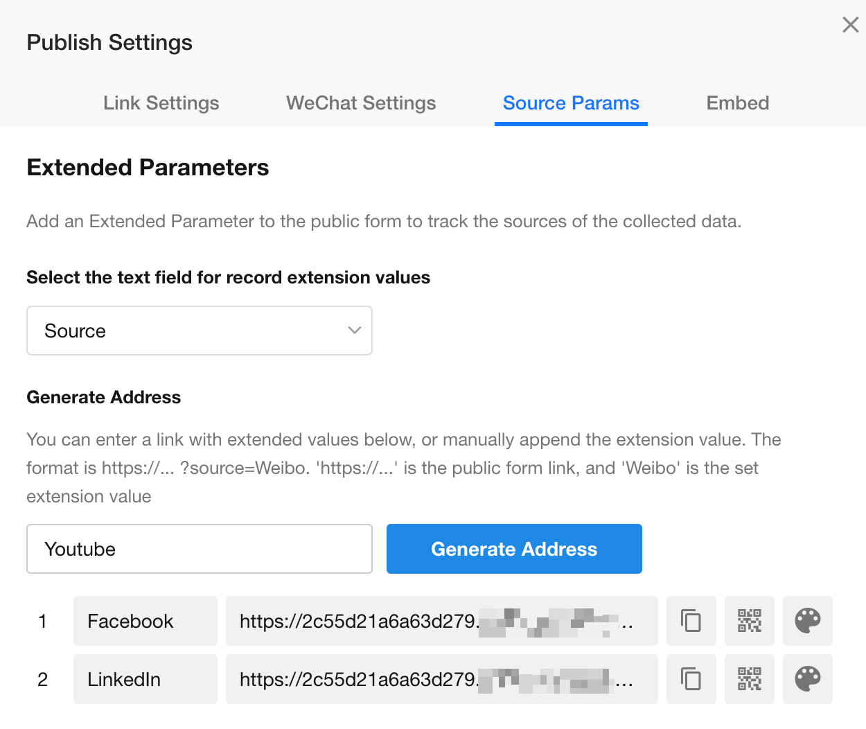 As shown above, if this public form is published on two channels - Facebook, LinkedIn - two corresponding dedicated links will be generated. The two data sources (Facebook, LinkedIn) will be recorded in the "Source" field of the worksheet.