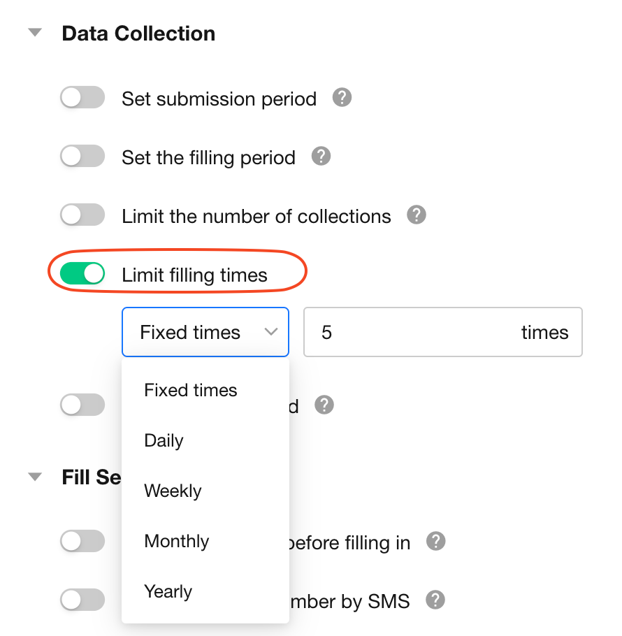 By default, there's no limit on how often each user can submit the public form. Settings are available to limit submissions per day/week/month/year.