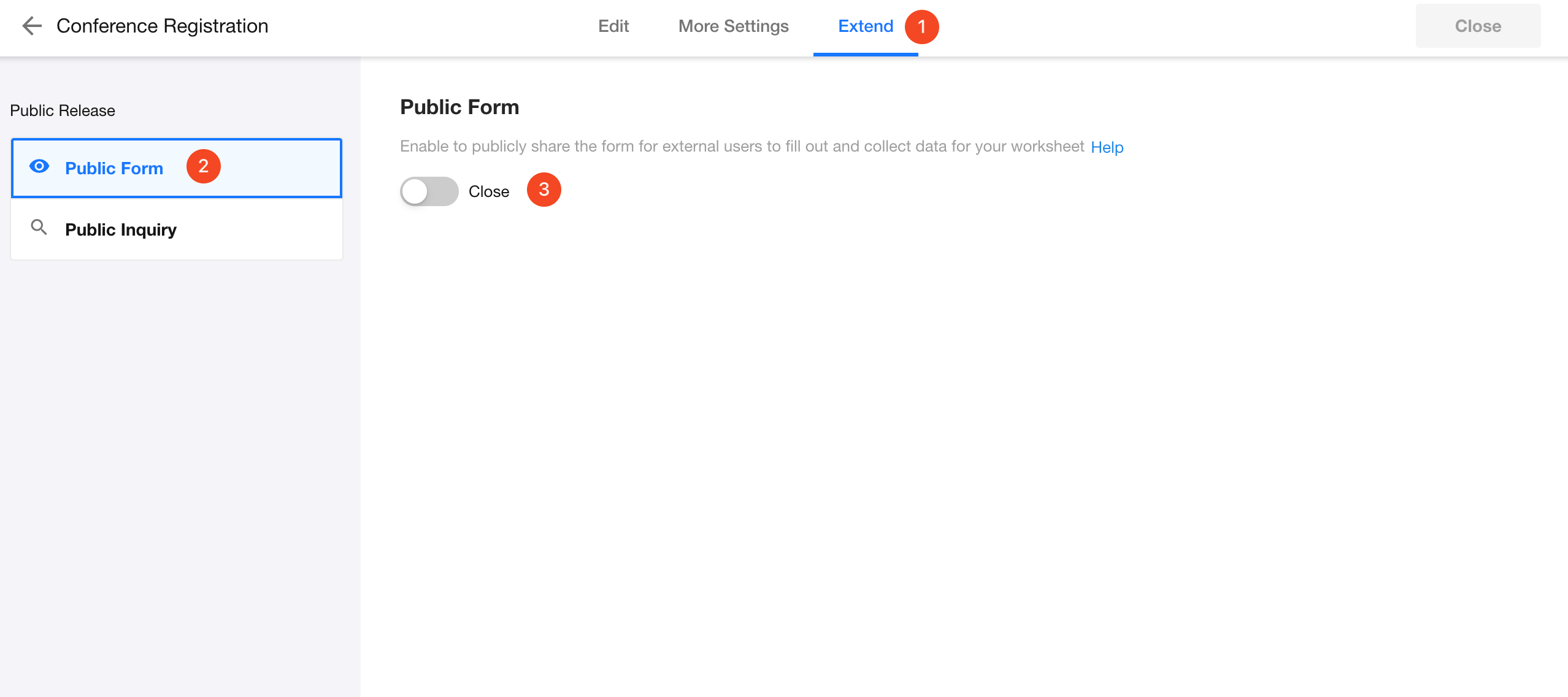 After designing the worksheet, click [Extend] > [Public Form], then enable "Public Form".