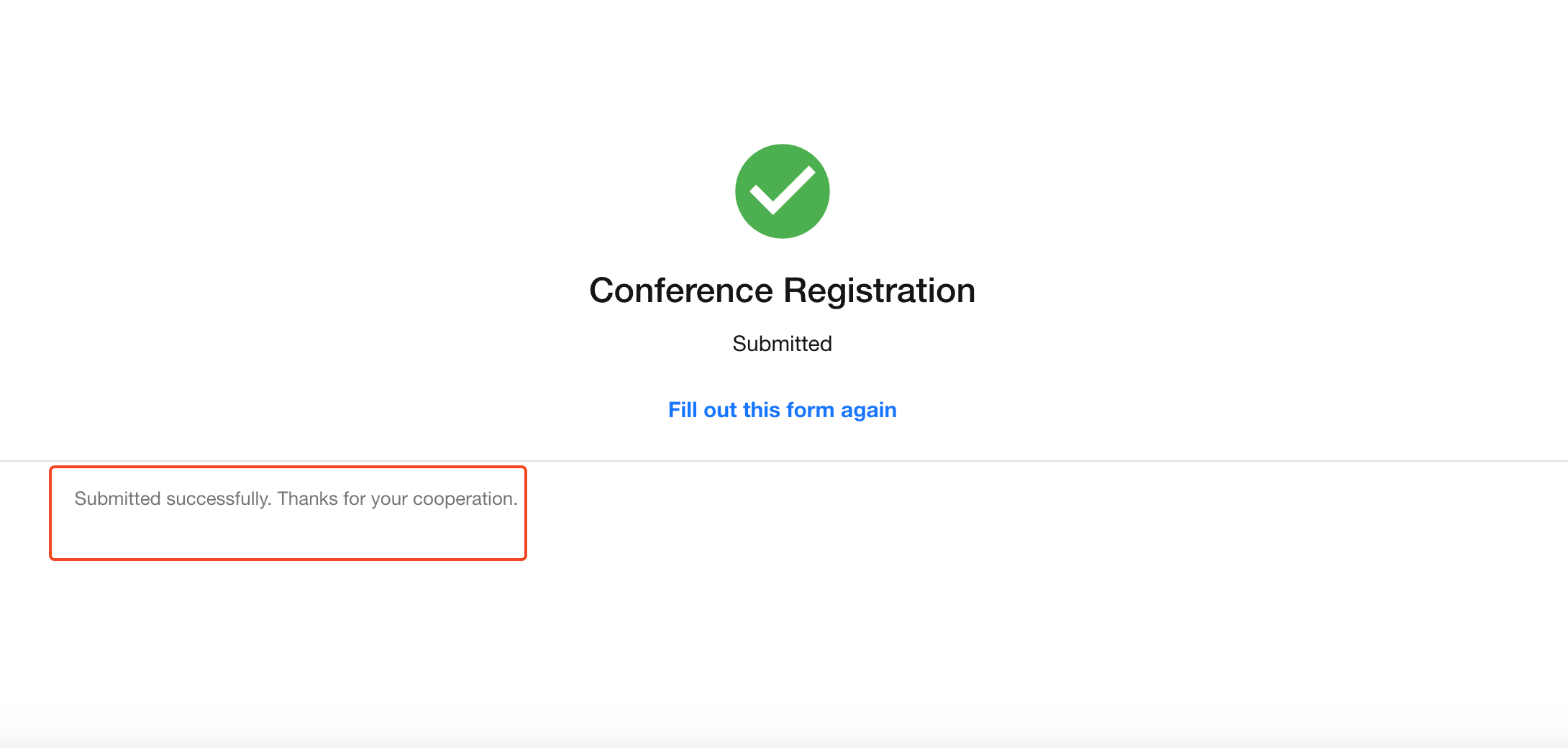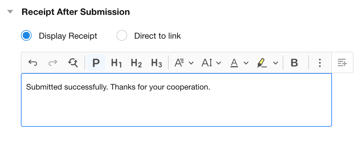 The receipt may also contain dynamic field values. Users can configure the post-submission receipt according to the actual business requirements of the public form.