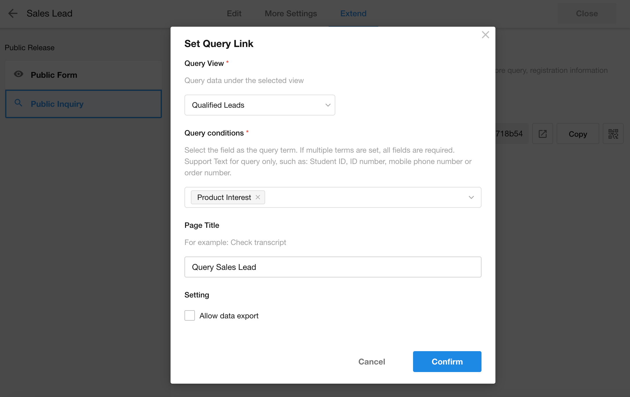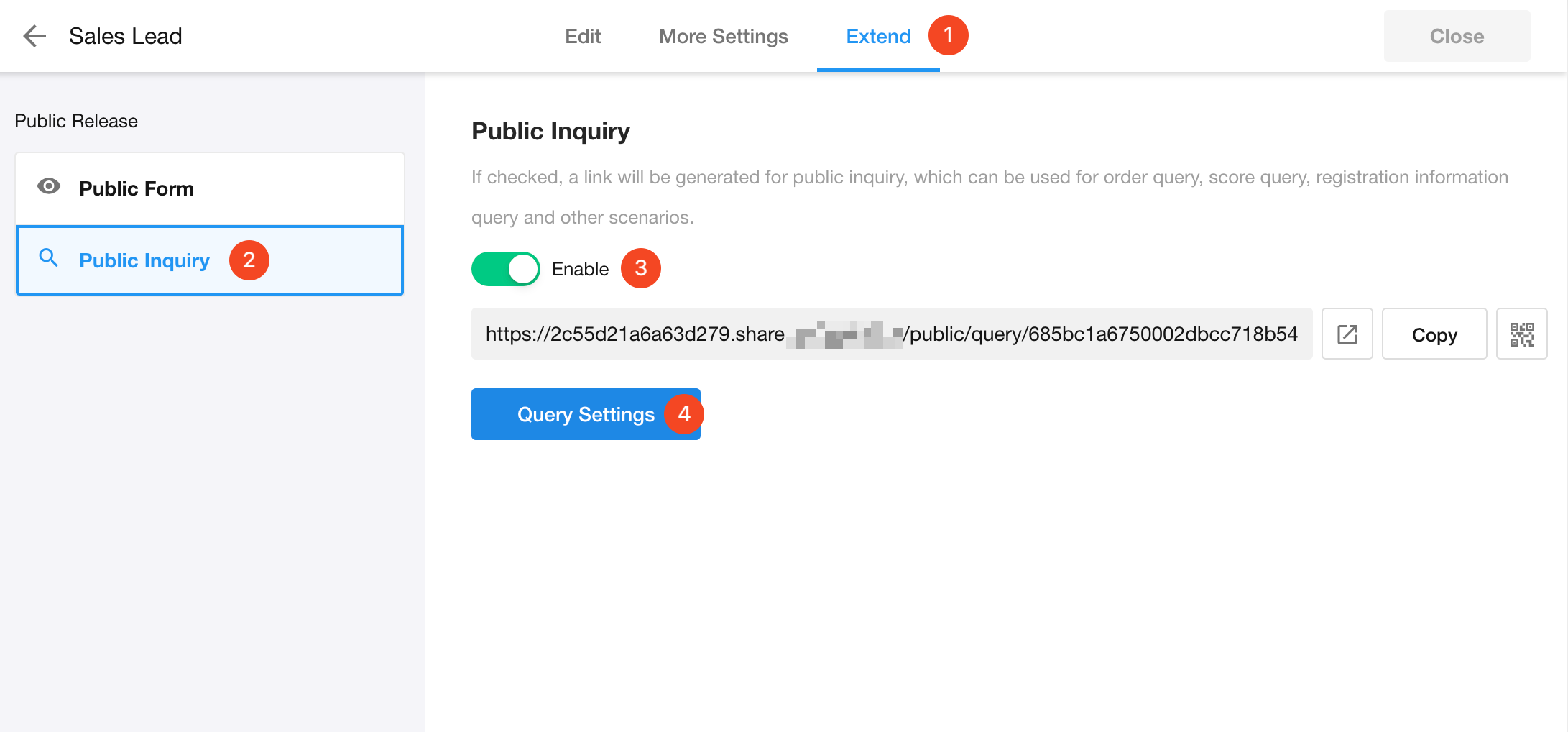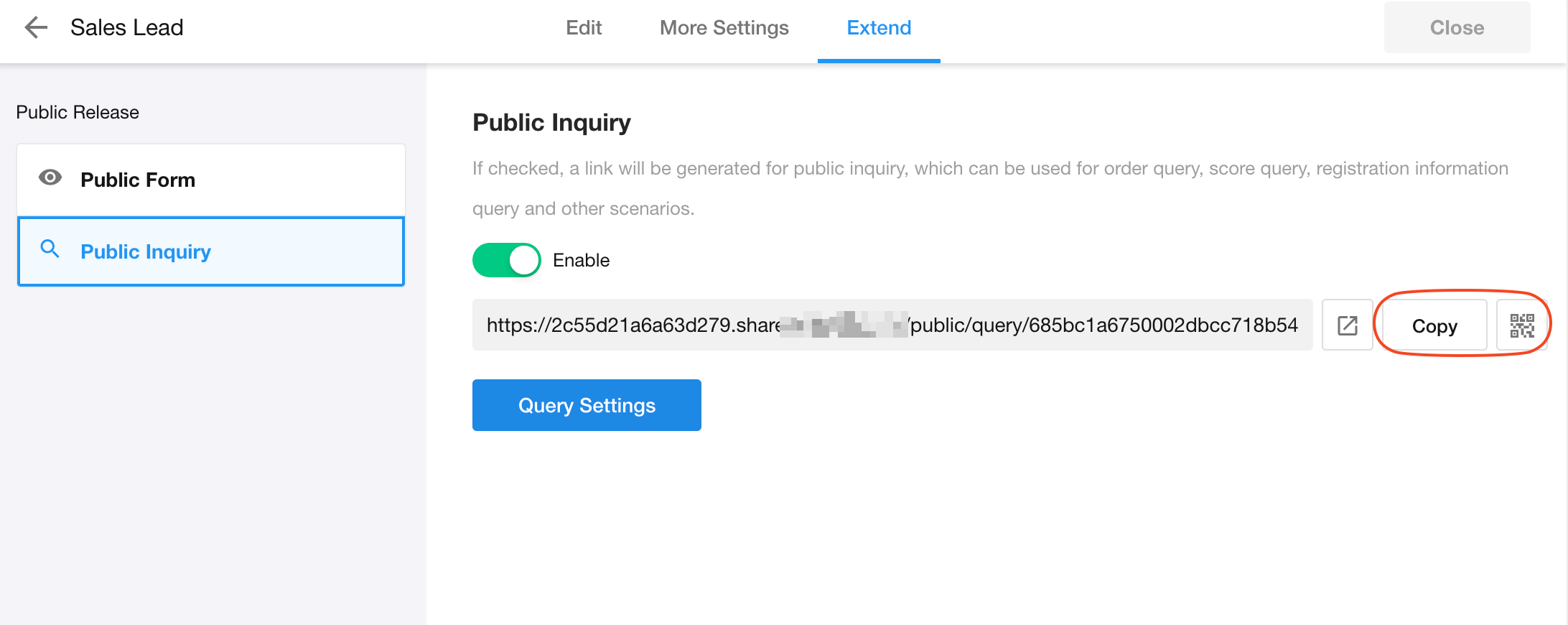 Go to [Form Settings] > [Extend], enable Public Inquiry, and then configure the query link.