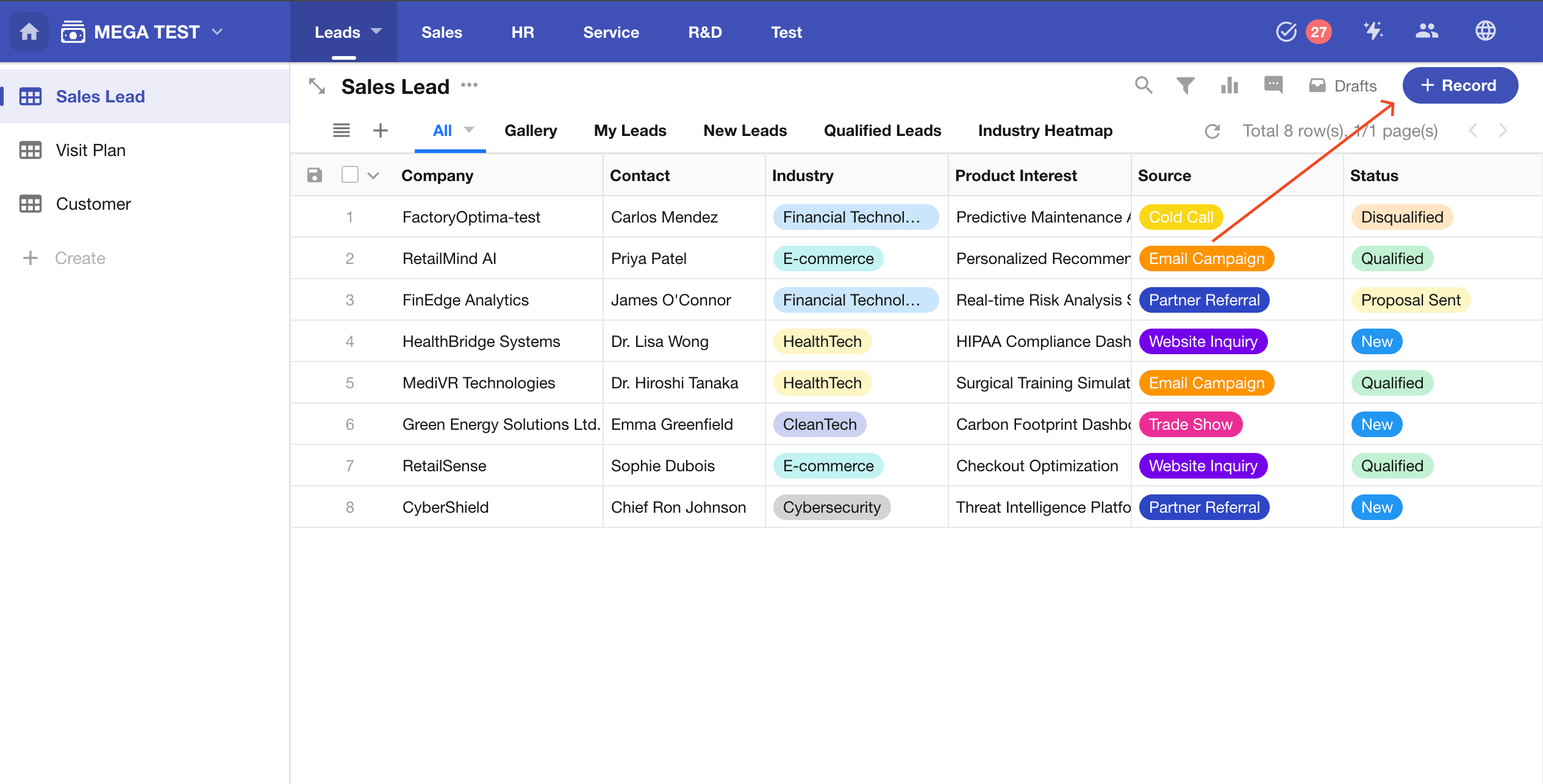 If you do not see the add record button on your interface, it means the application administrator has not granted you permission to add new records. Please contact the application administrator if needed.