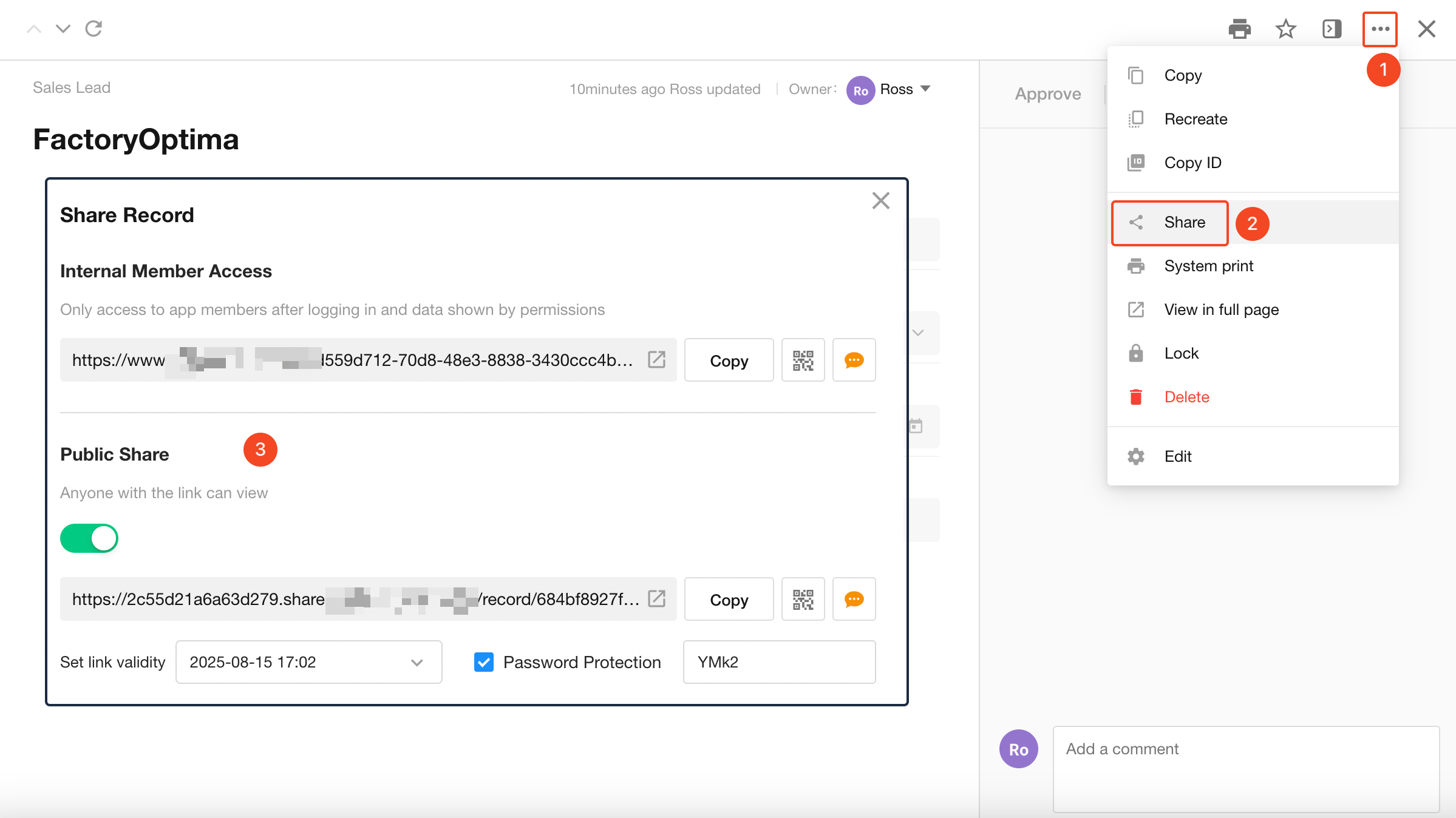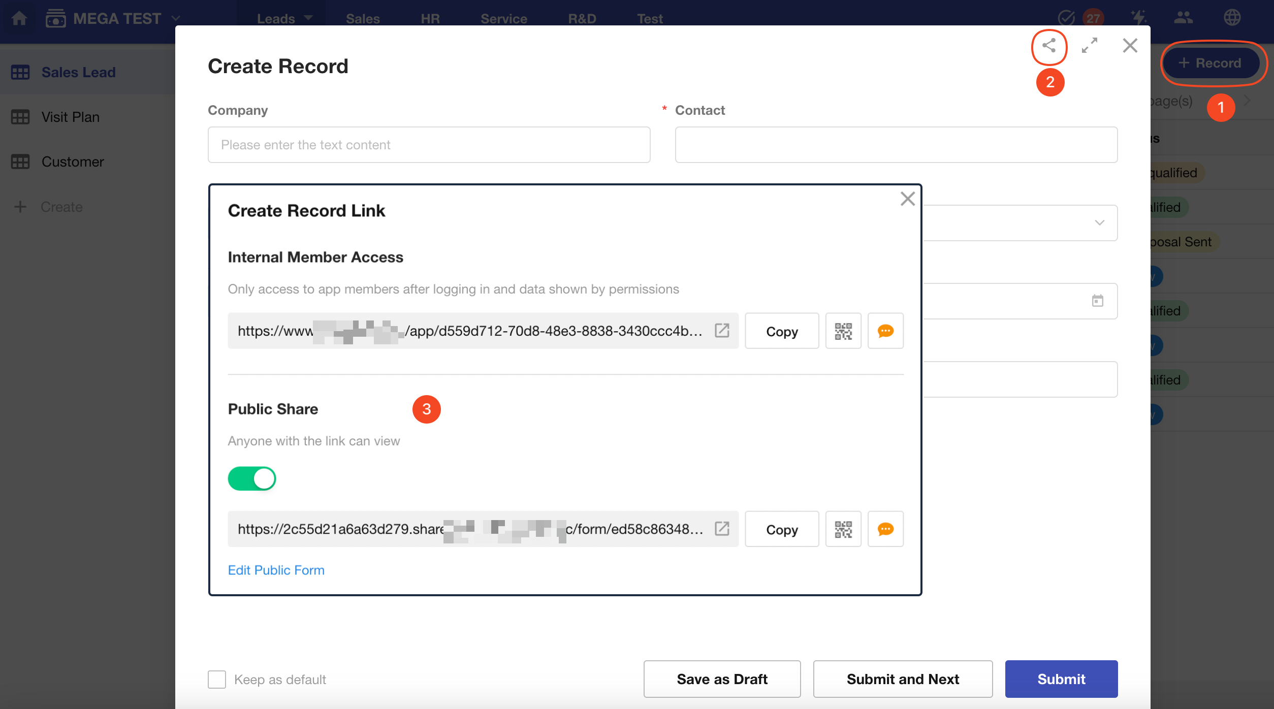 Click the “Share” button to enable public sharing of the record, then share the link or QR code with users.