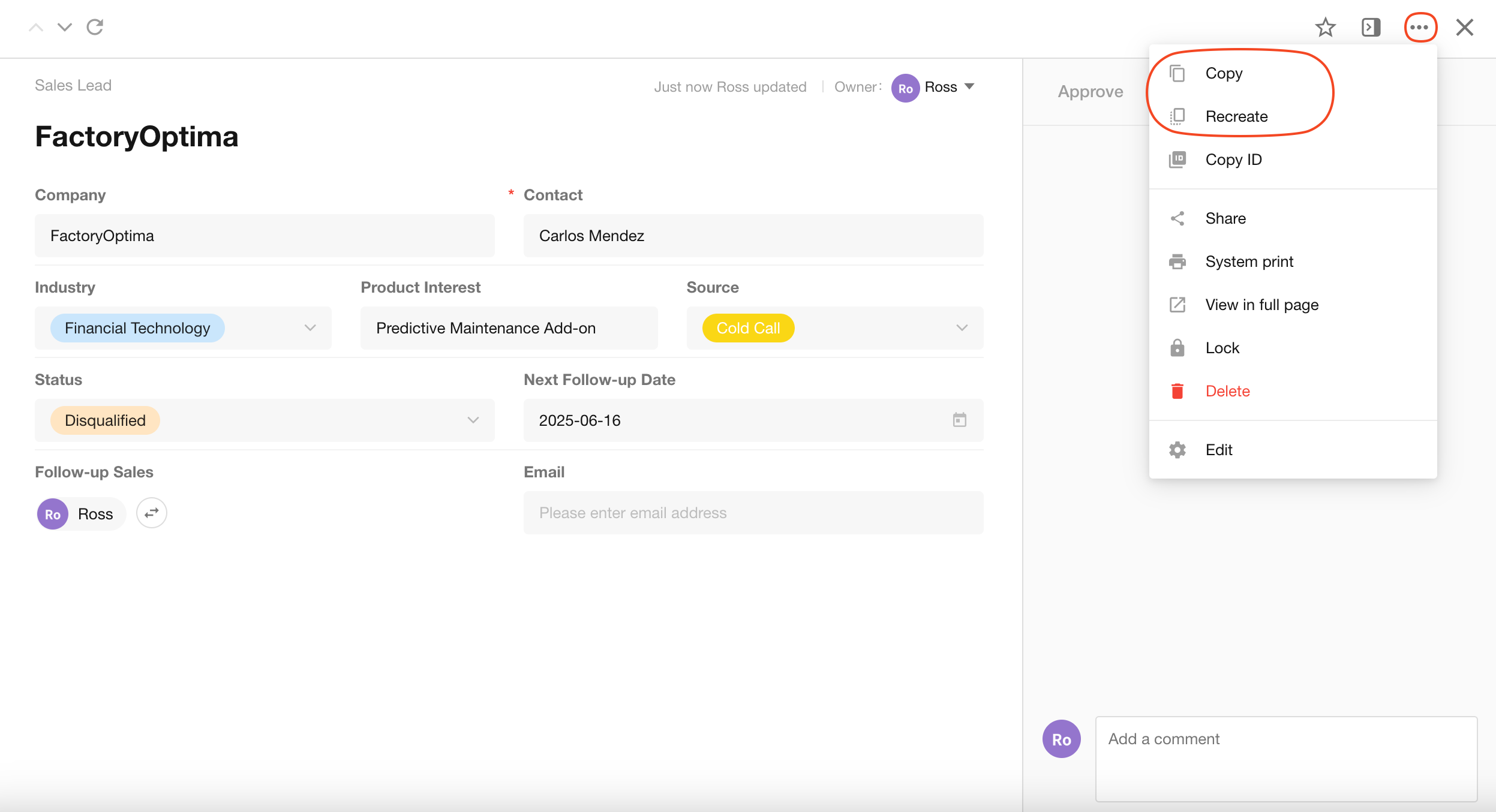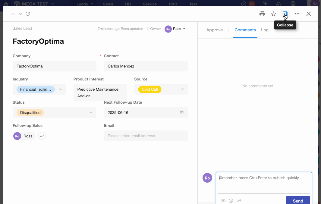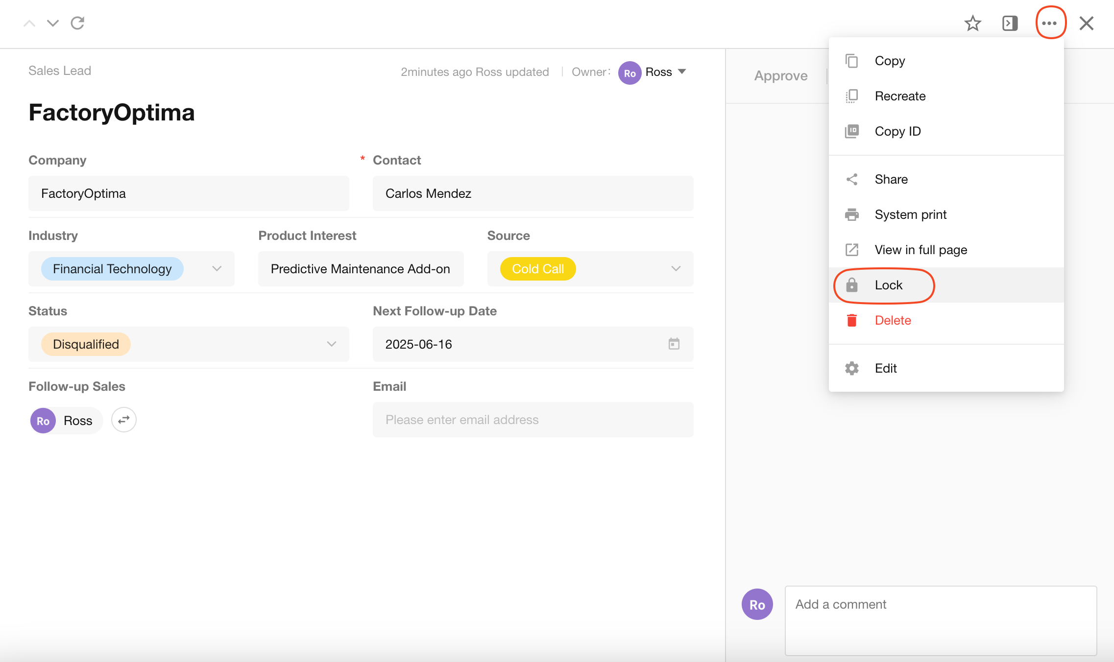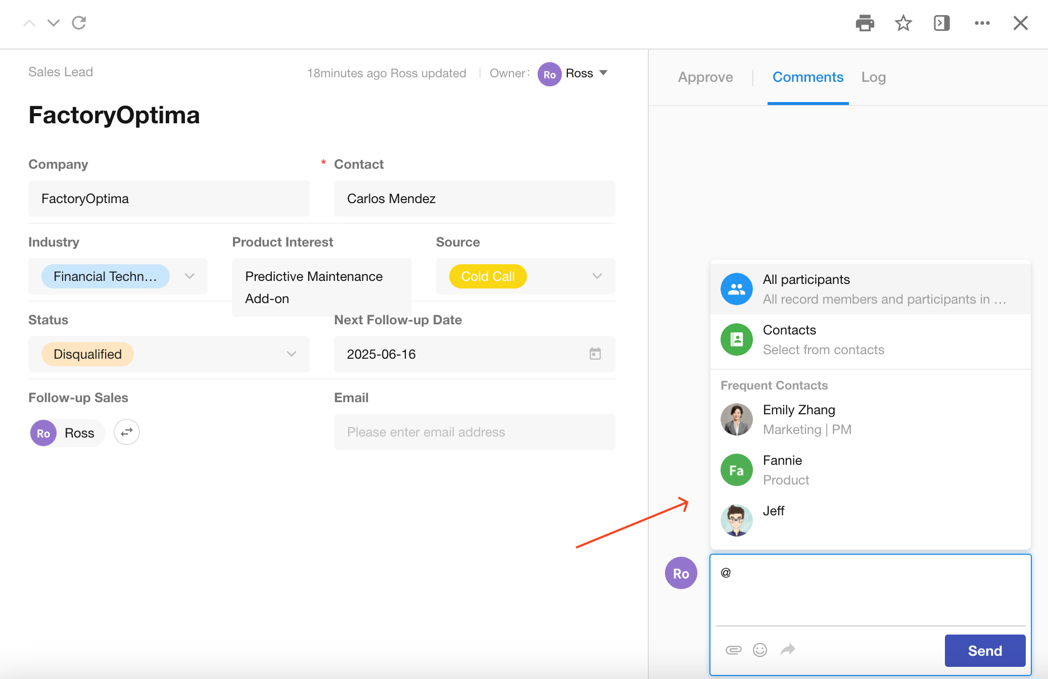 Users can comment on a record. By mentioning a specific person or mentioning all members of the record, relevant personnel will receive a notification. When replying to another’s comment, the user will also receive a notification.
