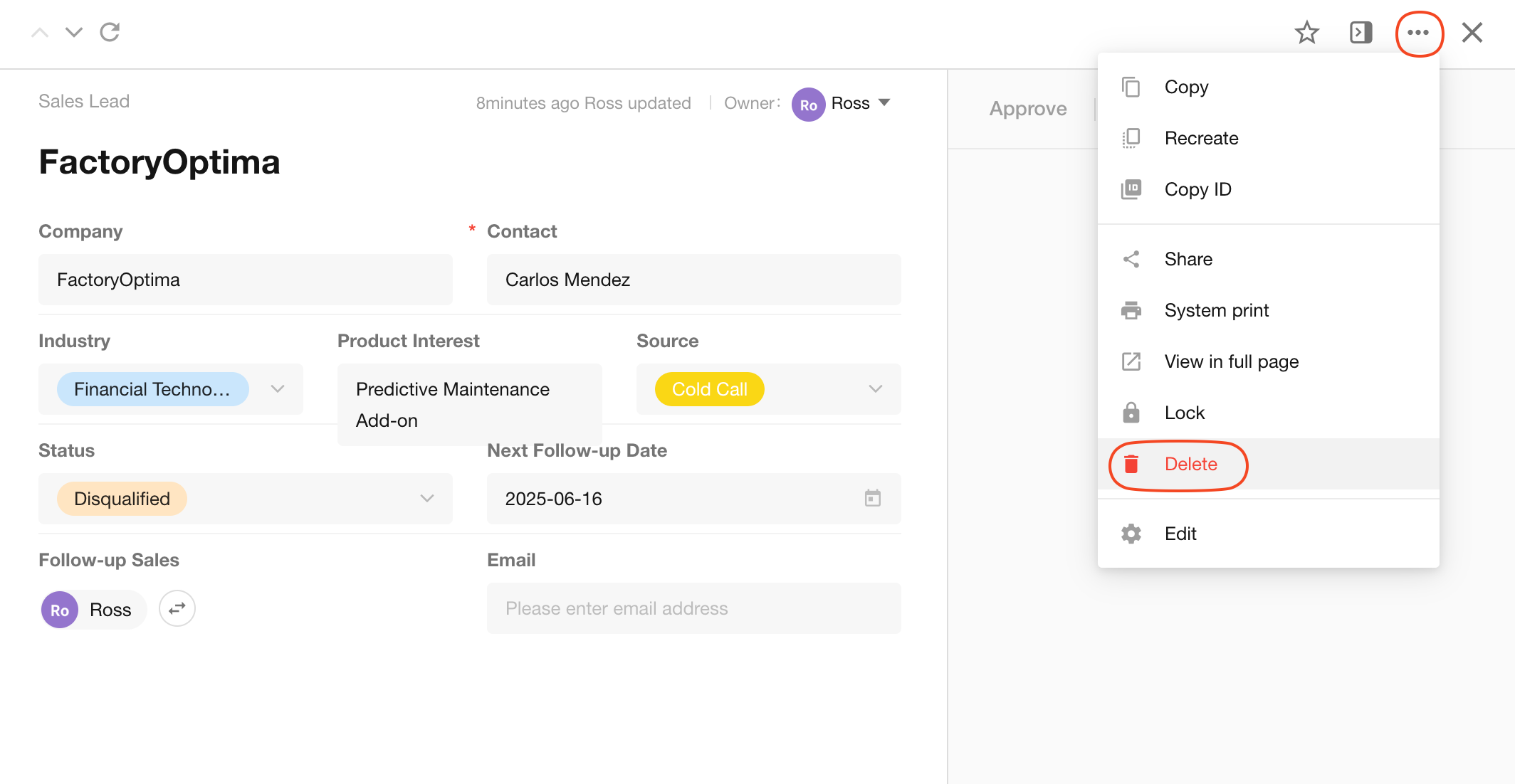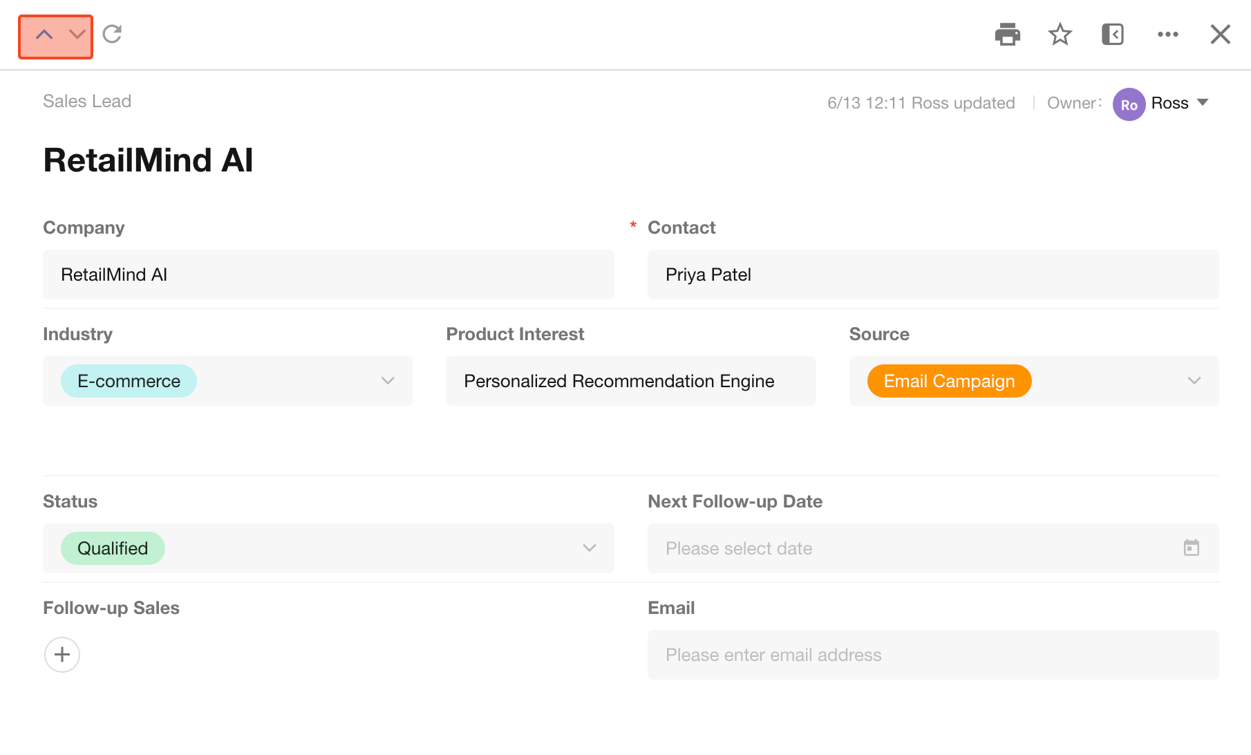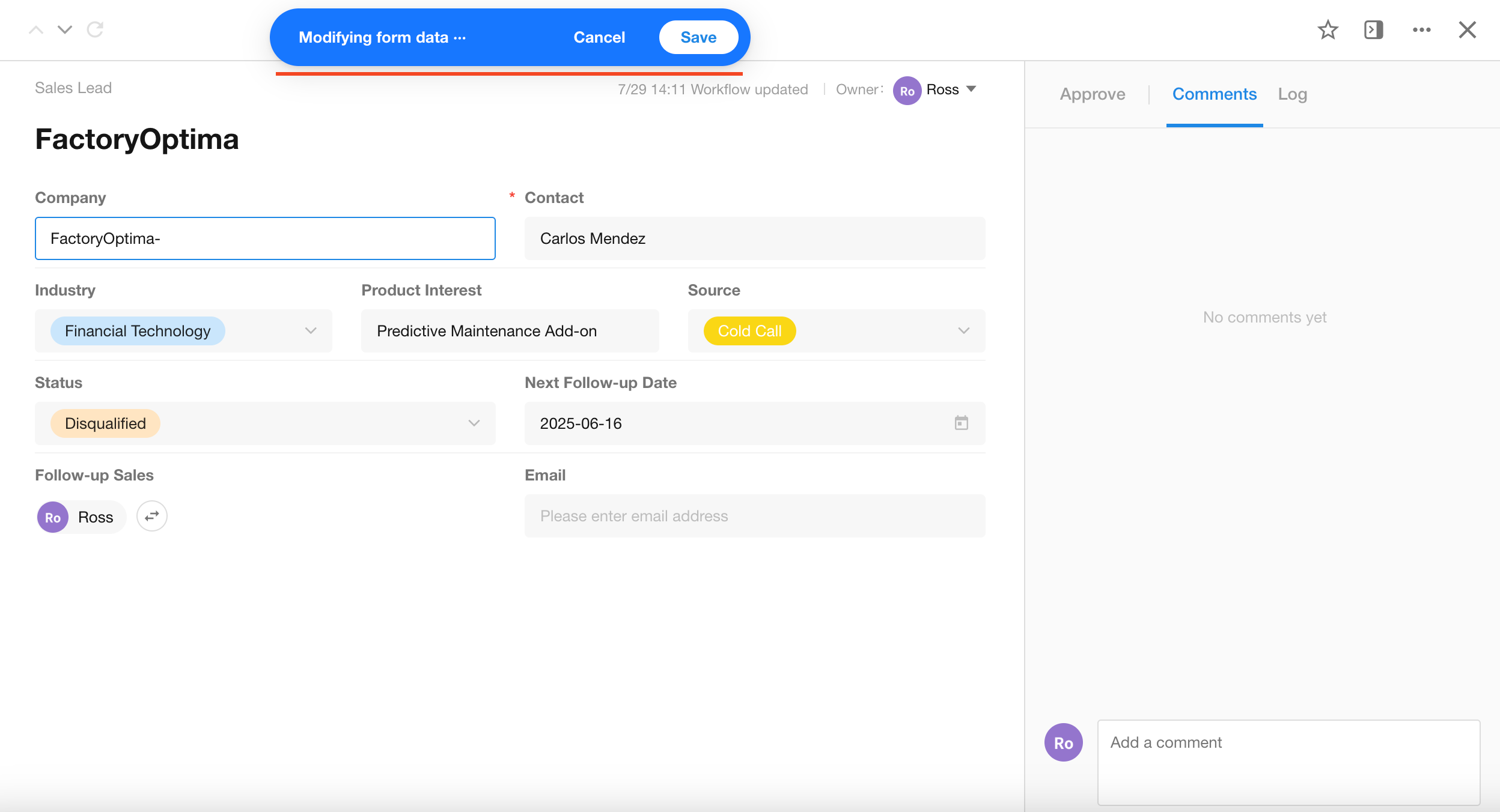 Users can comment on a record. By mentioning a specific person or mentioning all members of the record, relevant personnel will receive a notification. When replying to another’s comment, the user will also receive a notification.