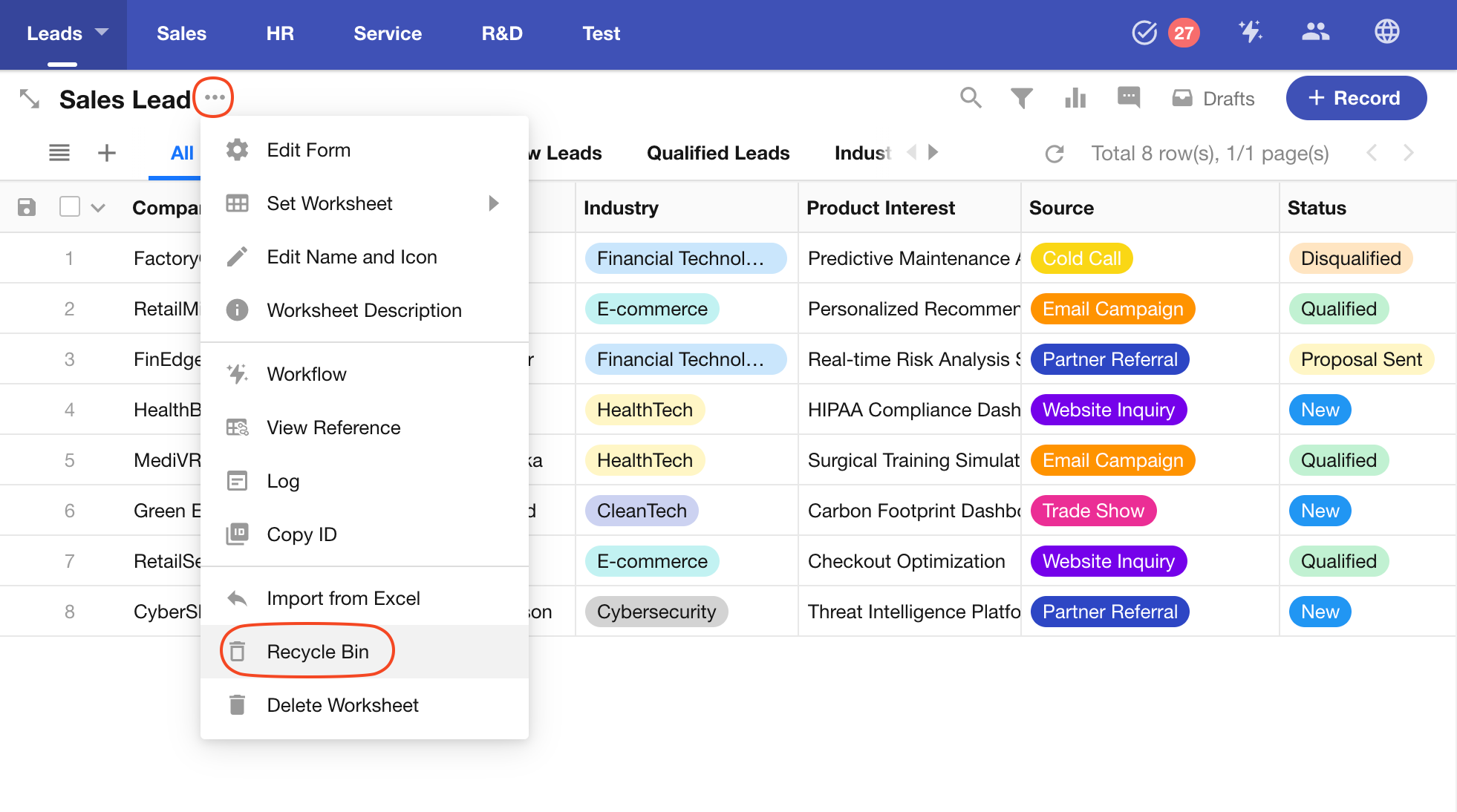 Deleted records are moved to the recycle bin in the worksheet and can be restored from there.
