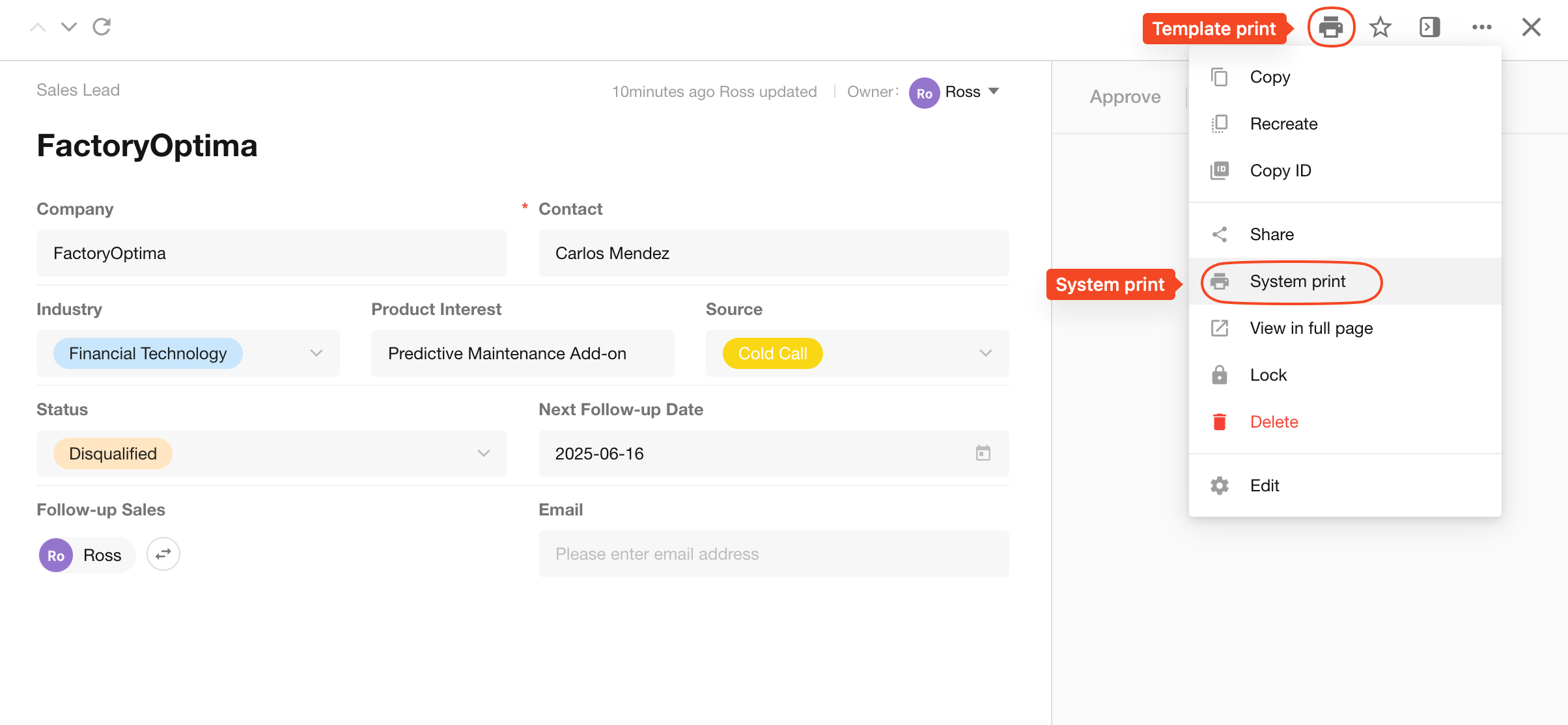 When printing a record, you can use the system’s default print or upload a Word/Excel print template, or save the system’s print configuration as a template to quickly print according to the template by clicking the print icon in the operation toolbar.