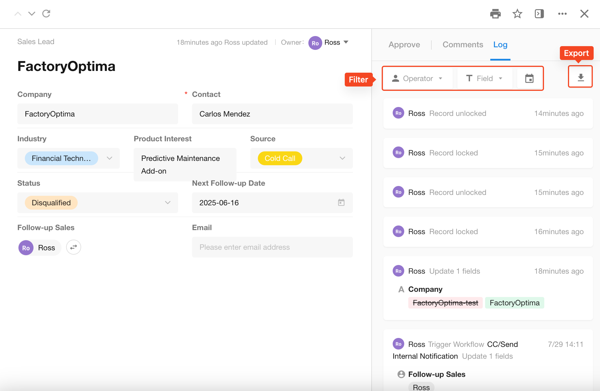 Every operation on a record is logged, such as who created the record, who modified it, what changes were made, what the record was before the modification, and what it is after. The record logs can be exported.