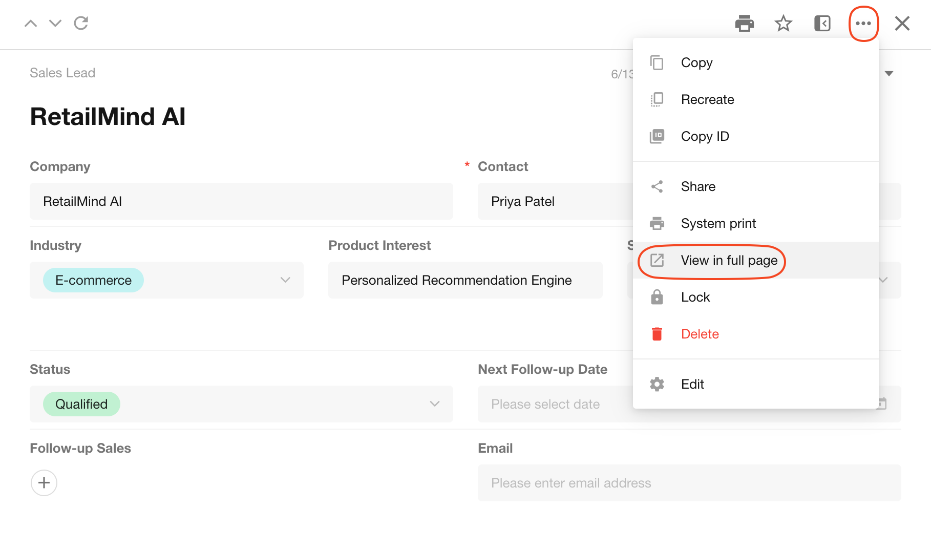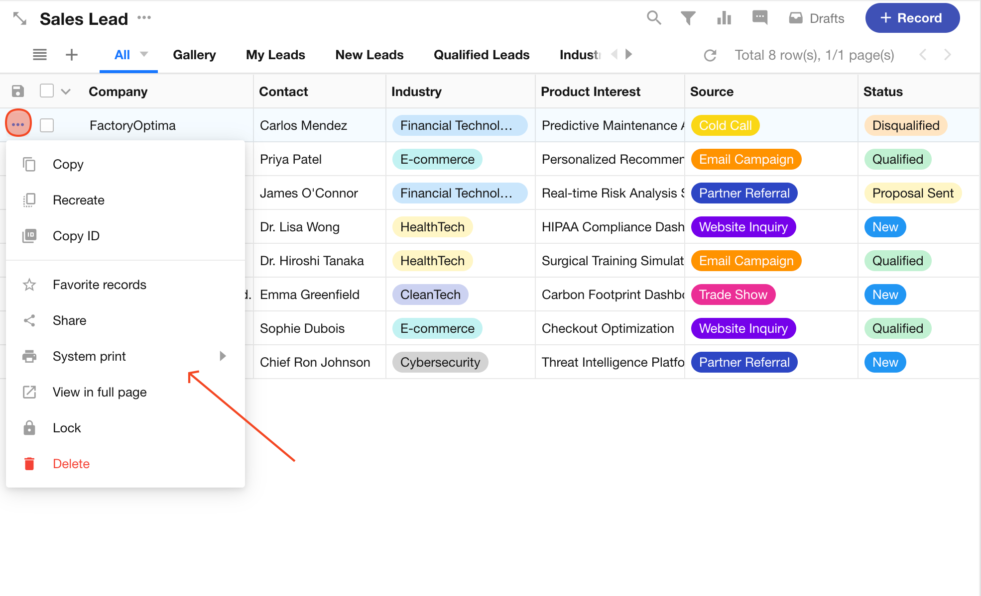 In the view, hover over a record to display shortcut operation buttons. Shortcut operations include adding to favorites, copying, recreating, deleting, printing, locking, sharing, and more.