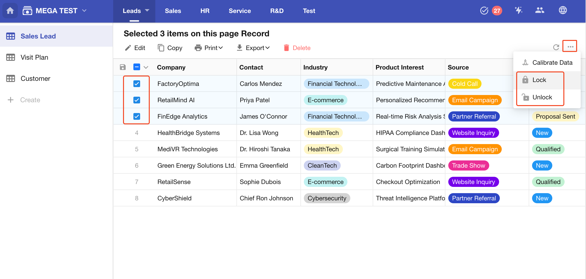 Application administrators can select multiple records and click the "More" button at the top-right of the page to lock or unlock records. A maximum of 1,000 records can be operated on at once.
