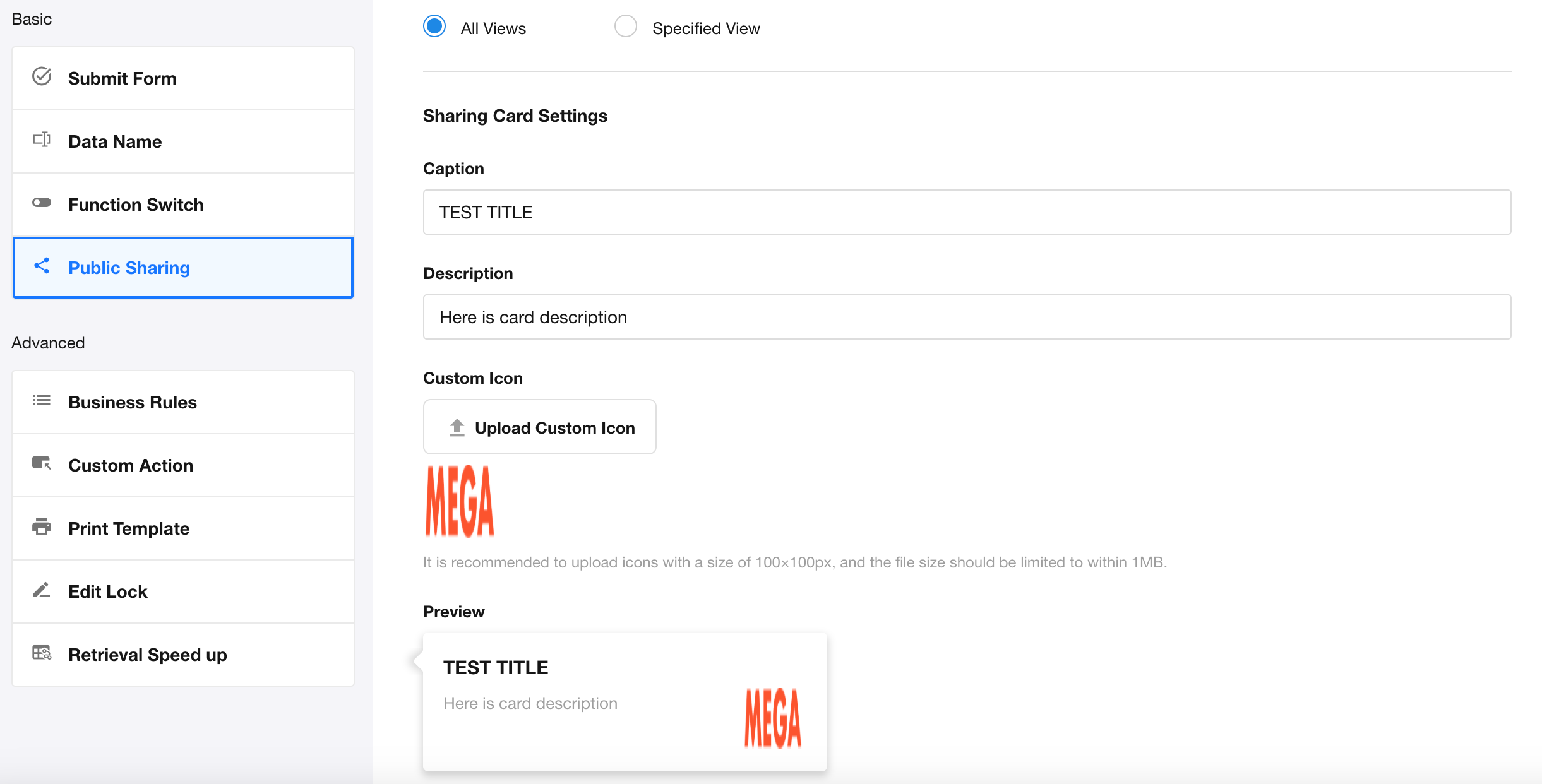 - Custom Icon: Defaults to the view icon; custom uploads are supported