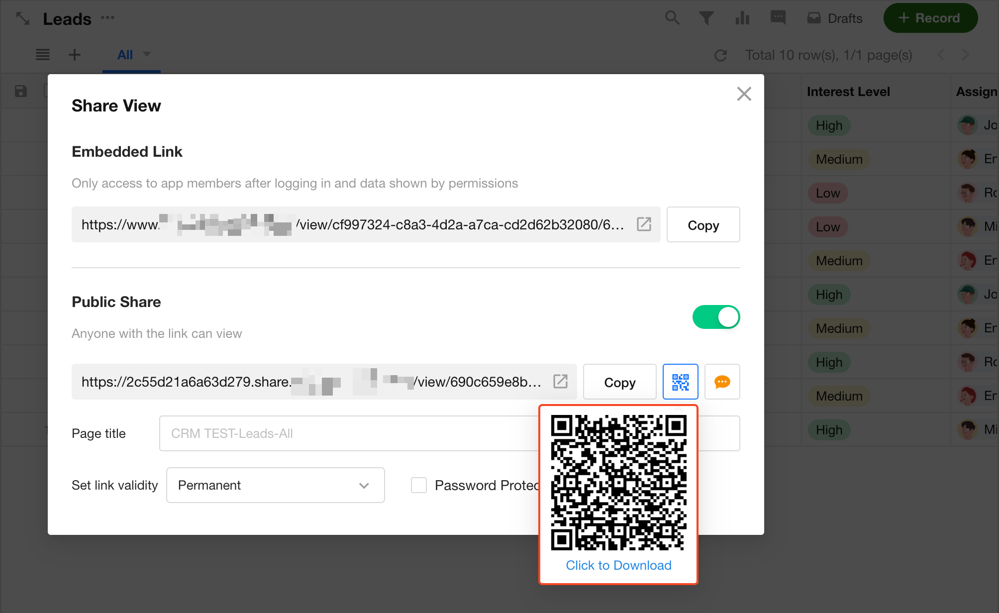 Anyone with the shared link can view the data in the view and access detailed record information.