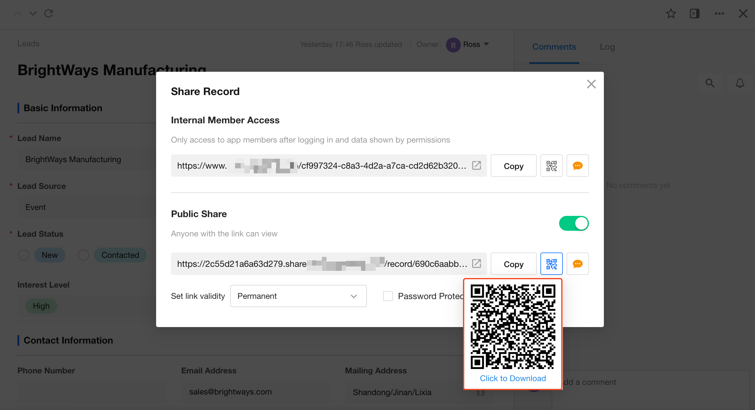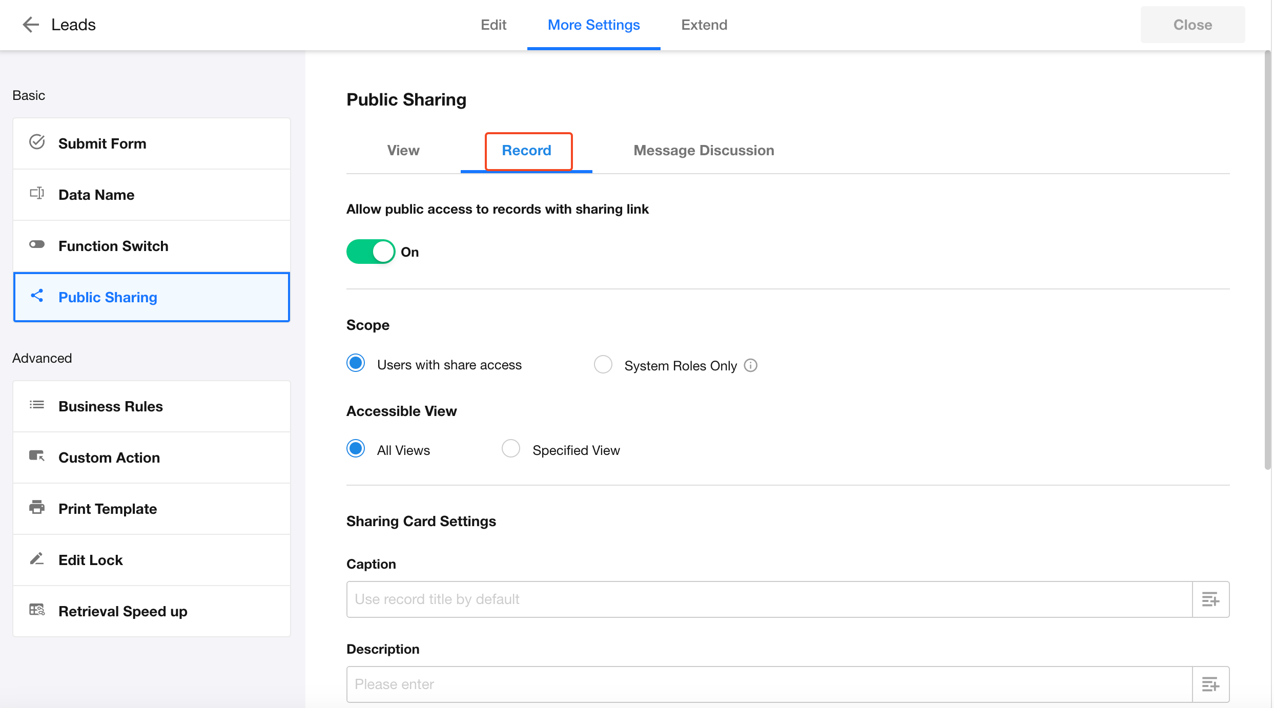 Navigate to [Edit Form] > [More Settings] > [Public Sharing], and switch to the "Record" tab to enable or disable the record sharing feature.