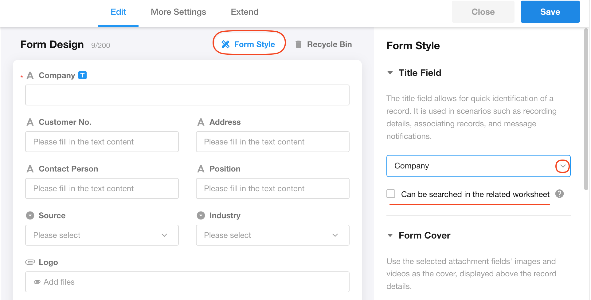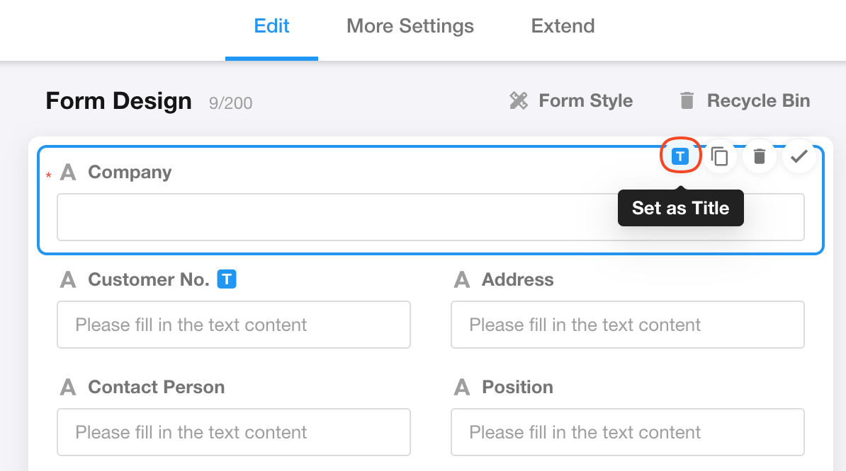 For a title field, typically select a field with distinct identification and uniqueness, allowing users to confirm the desired record just by viewing the title field. Form settings cannot be saved without designating a title field.